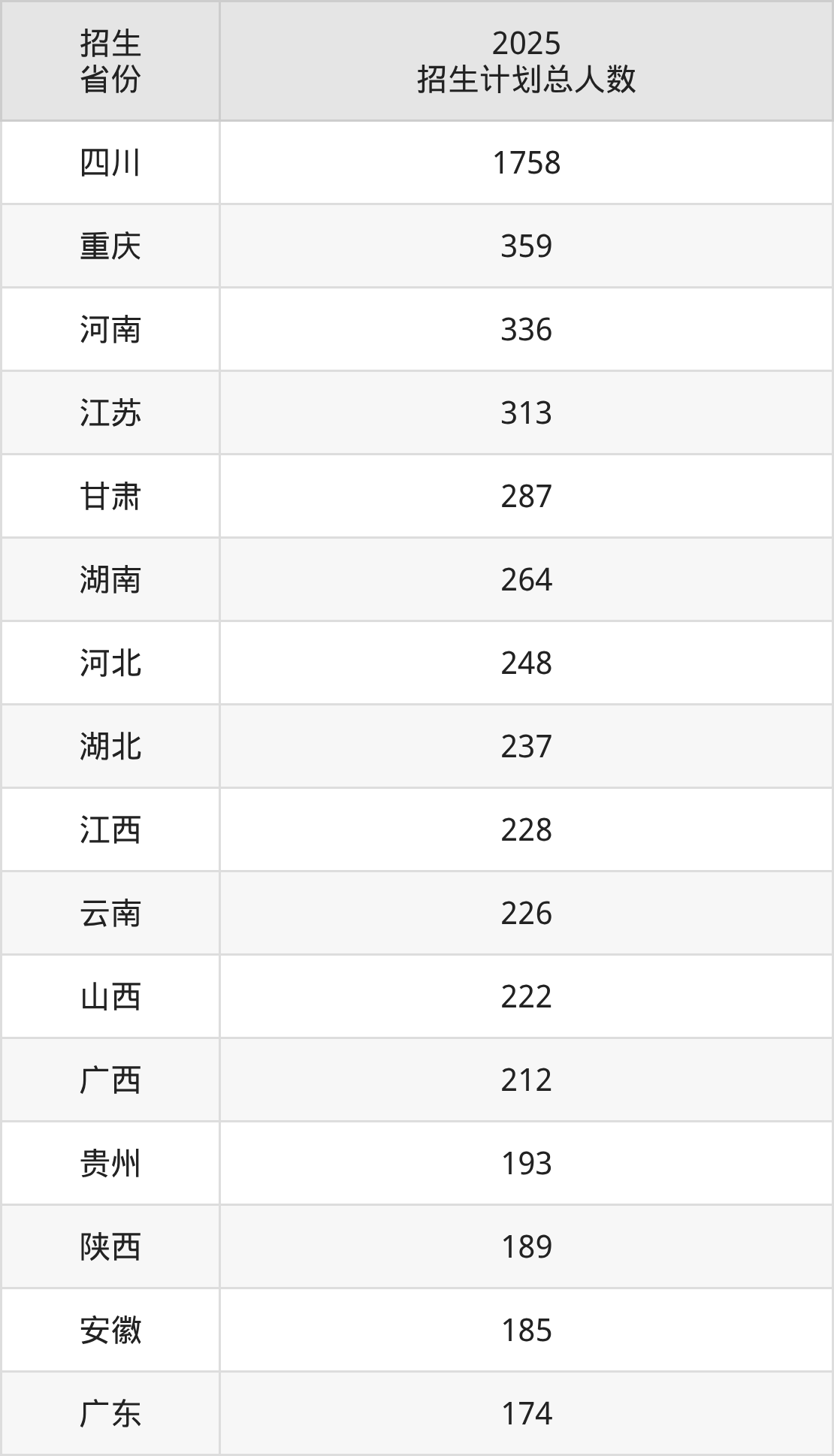 2025年西南交通大学面向全国28个省市开展本科招生;招生专业共66个,招生人数共6327人。2025年在四川省招生计划总人数是1758人,其中,西南交通大学在四川省招生人数最多的是电气工程及其自动化。西南交通大学在各省具体招生人数情况如下表。