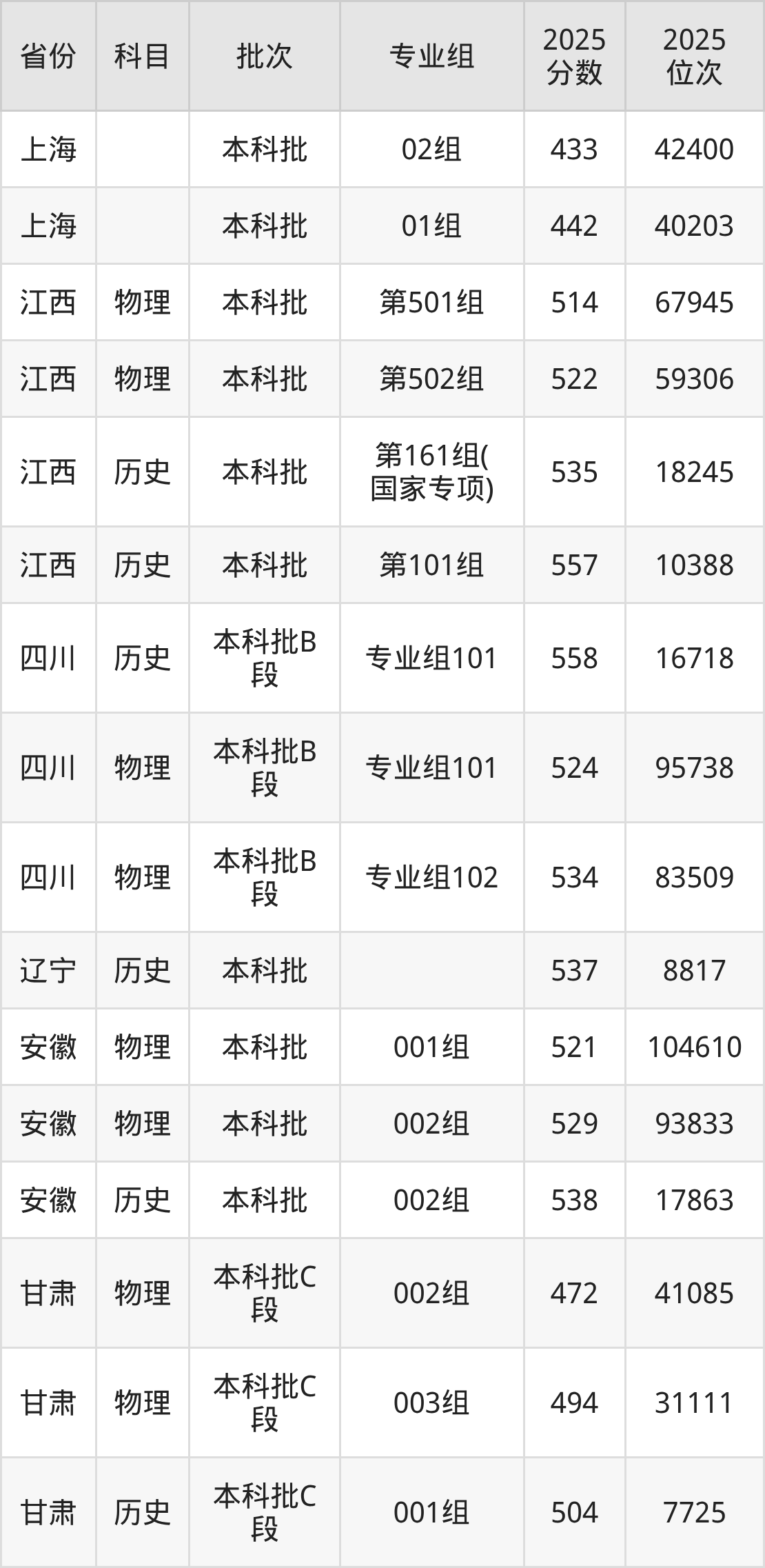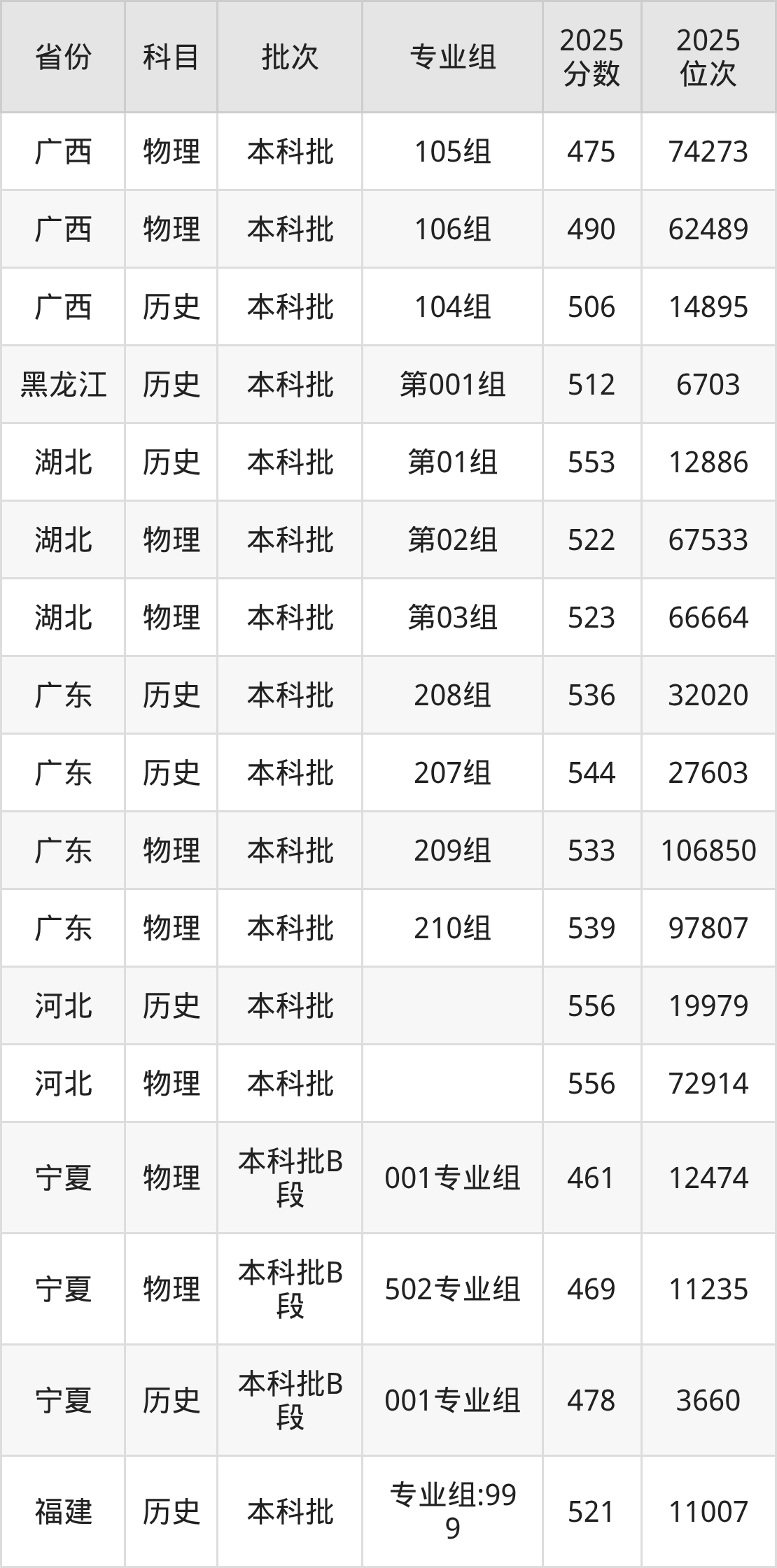 2025年在本科历史类进行招生,各专业组分数线详情如下: