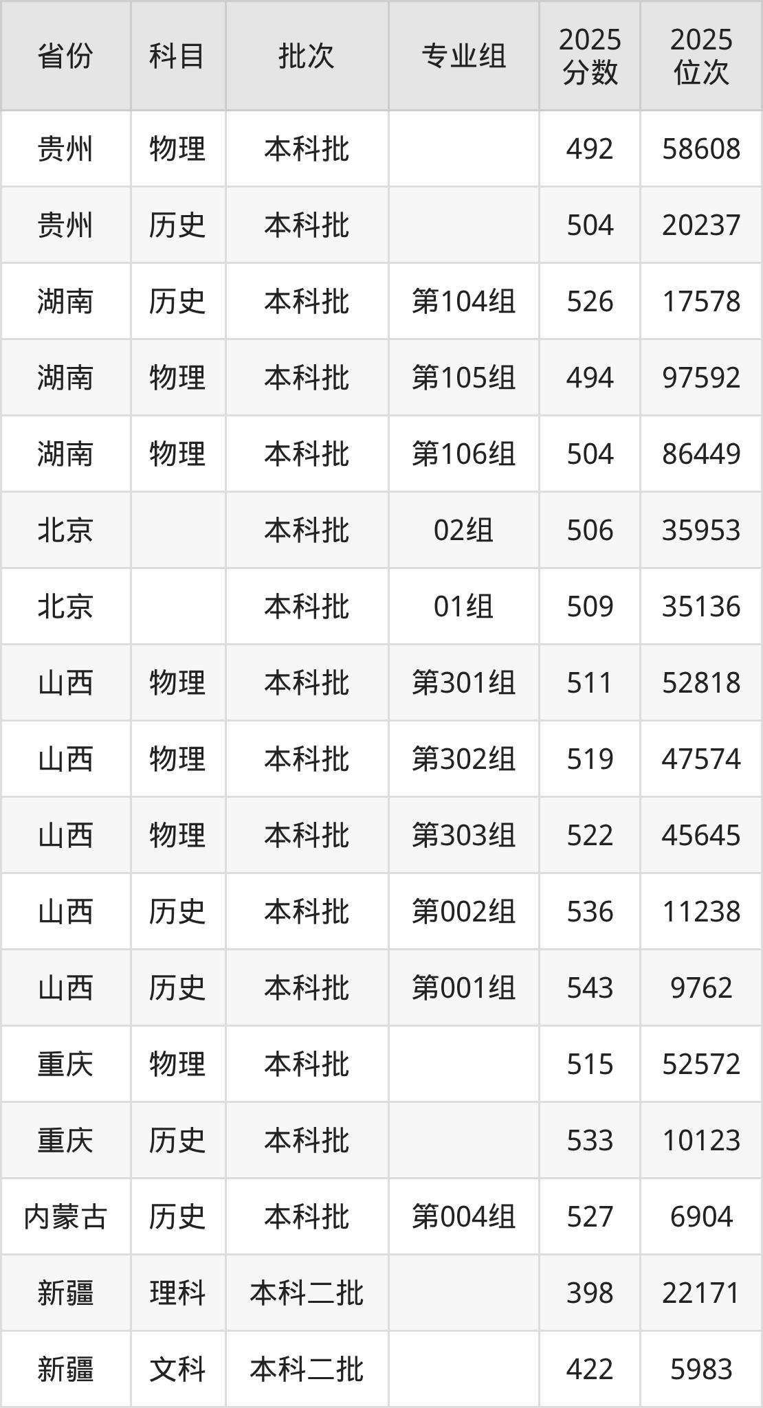 2025年投档录取最低分为492分,录取最低位次为58608名。