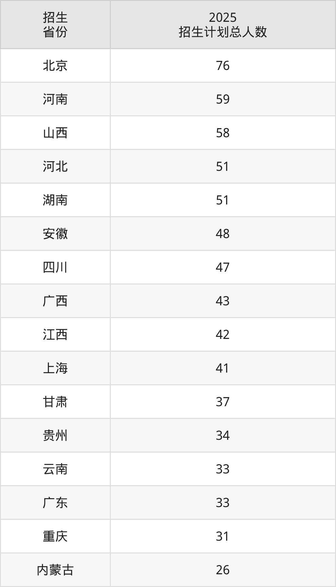2025年中华女子学院面向全国23个省市开展本科招生;招生专业共16个,招生人数共833人。2025年在北京市招生计划总人数是76人,其中,中华女子学院在北京市招生人数最多的是学前教育。中华女子学院在各省具体招生人数情况如下表。