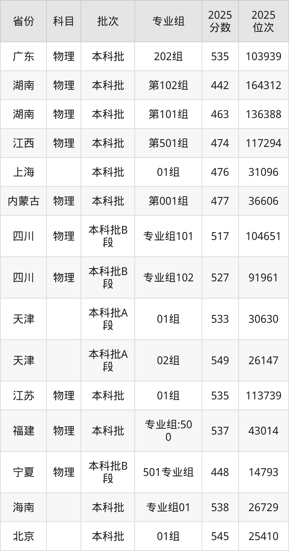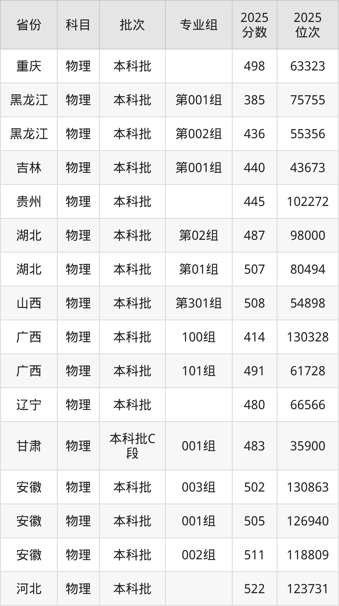 2025年在本科物理类进行招生,各专业组分数线详情如下: