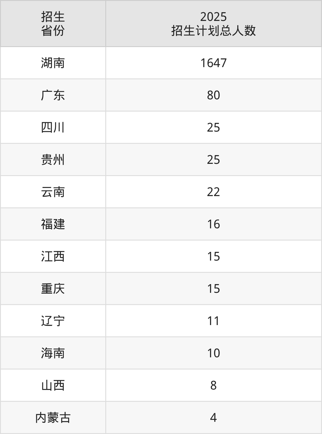 2025年湘潭医卫职业技术学院面向全国12个省市开展专科招生;招生专业共15个,招生人数共1878人。2025年在湖南省招生计划总人数是1647人,其中,湘潭医卫职业技术学院在湖南省招生人数最多的是护理。湘潭医卫职业技术学院在各省具体招生人数情况如下表。