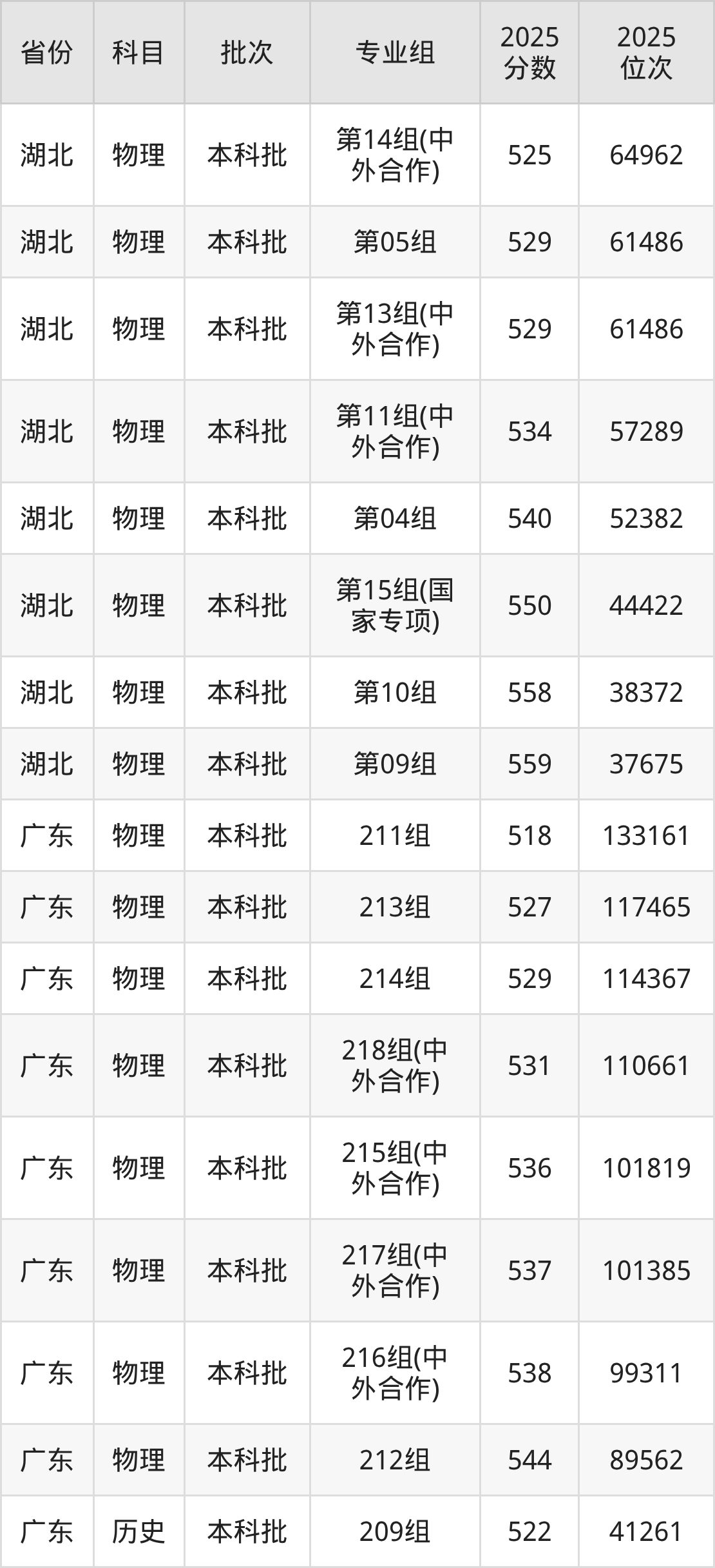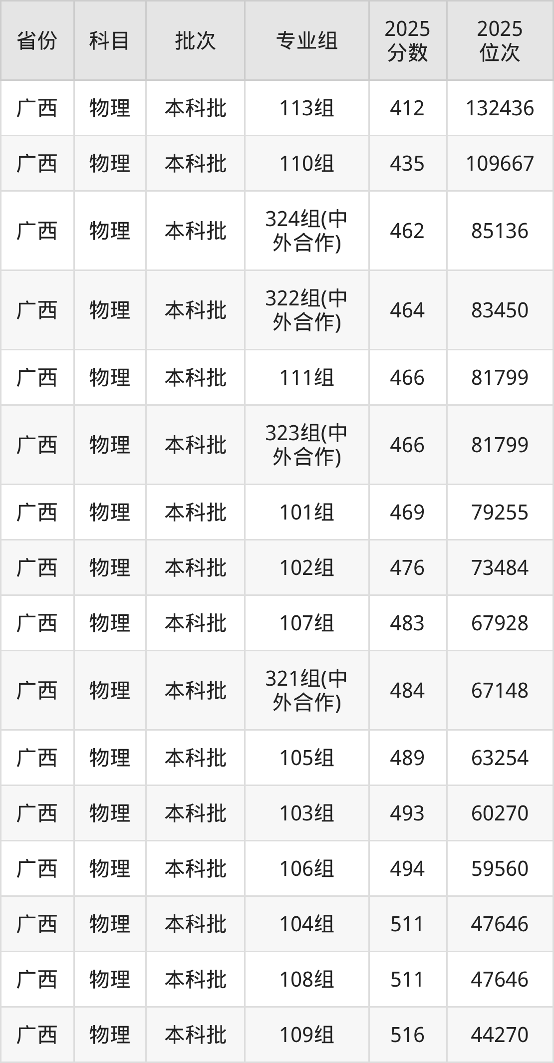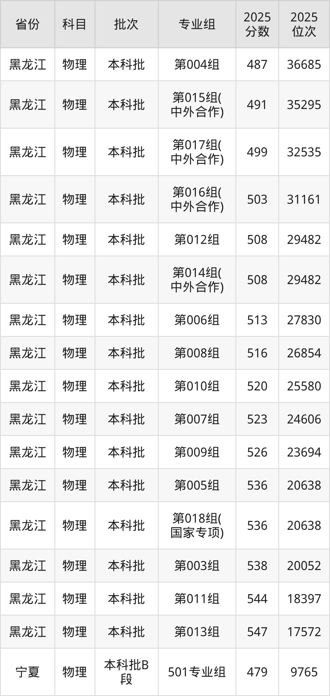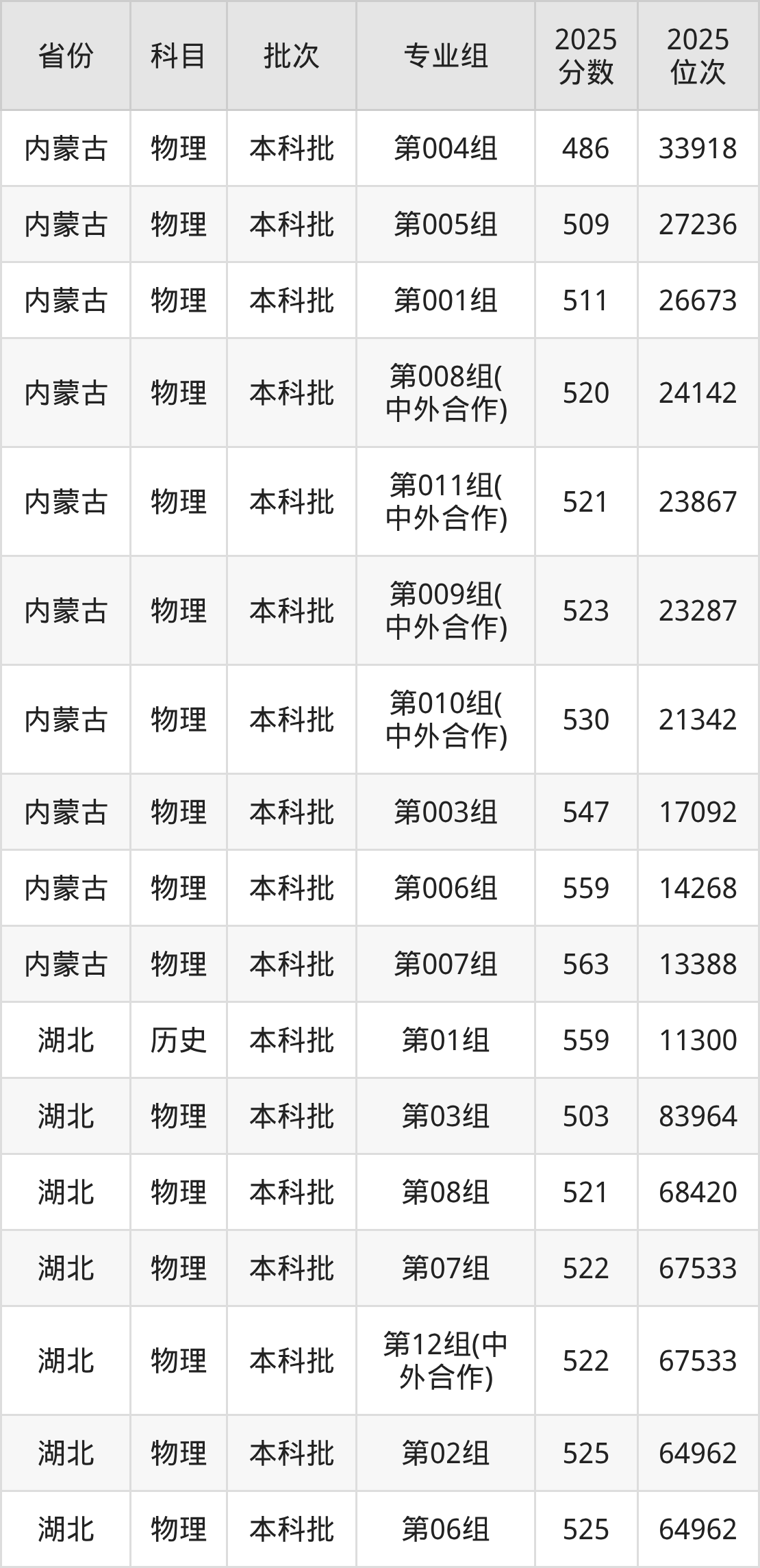 2025年在本科物理类进行招生,各专业组分数线详情如下: