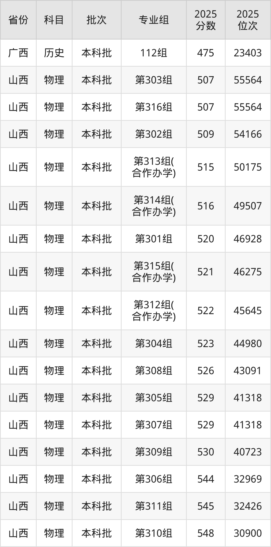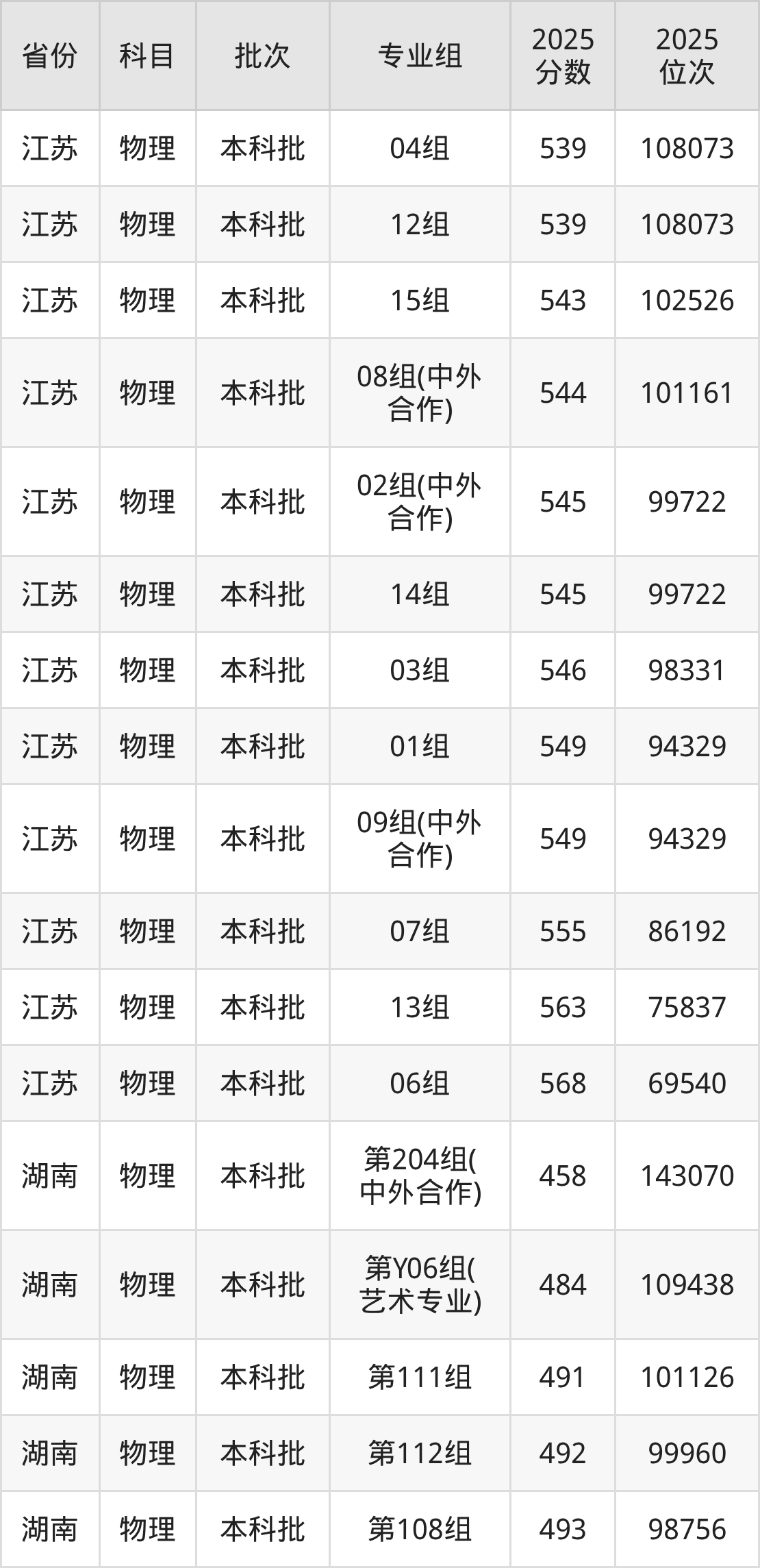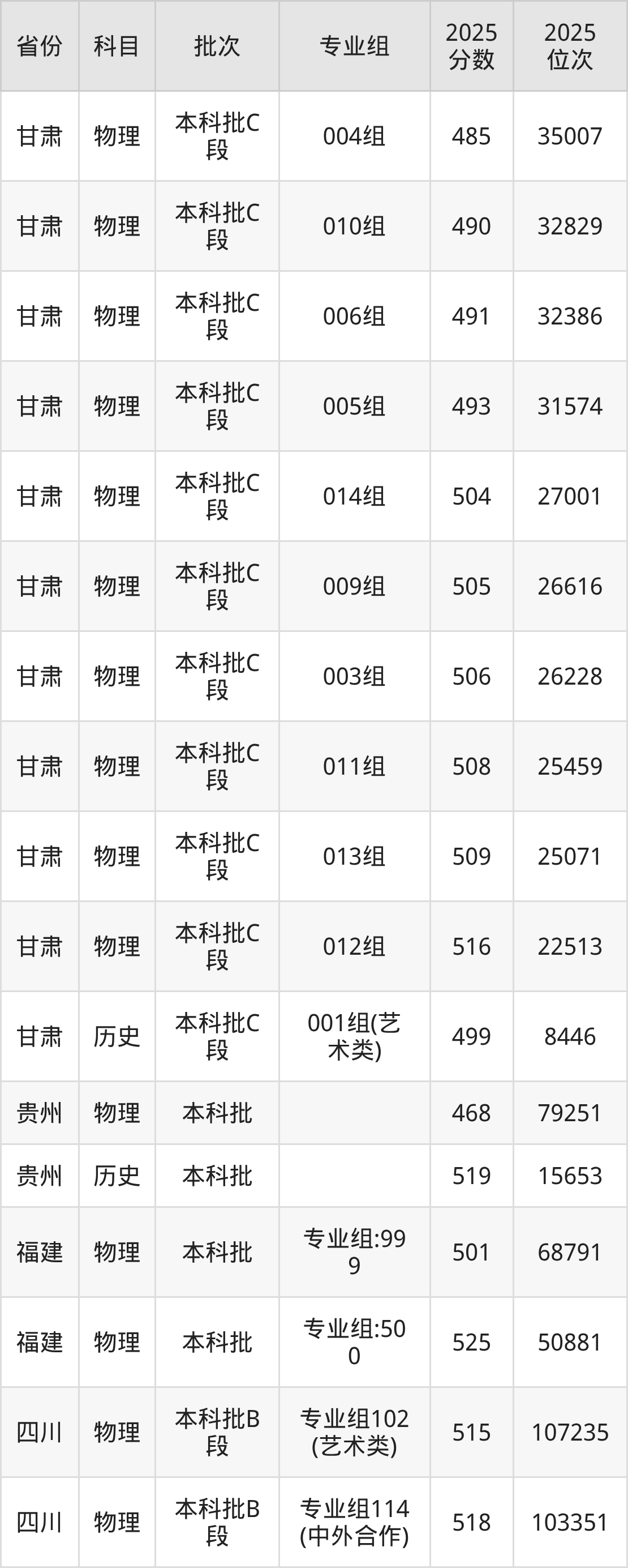 2025年在本科物理类进行招生,各专业组分数线详情如下: