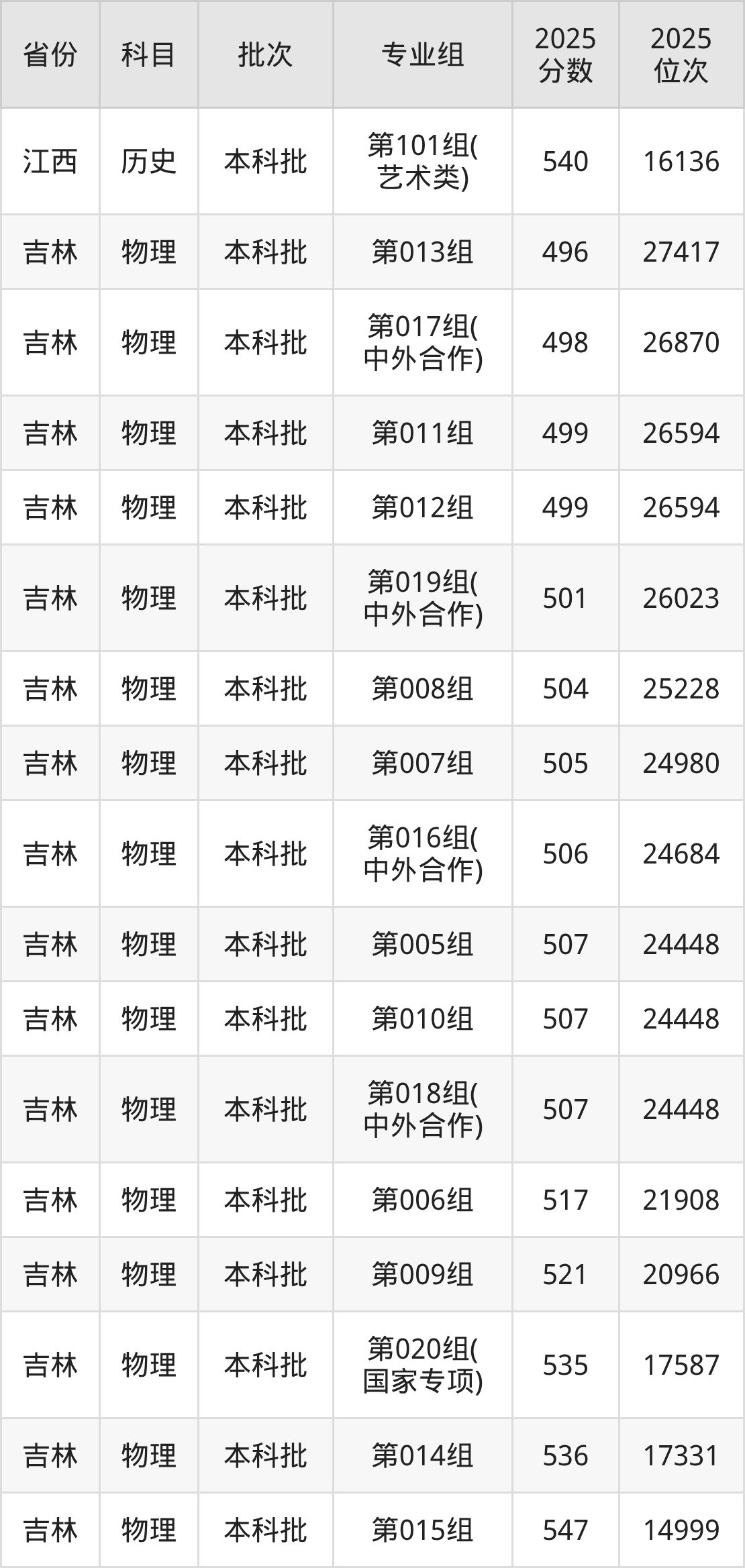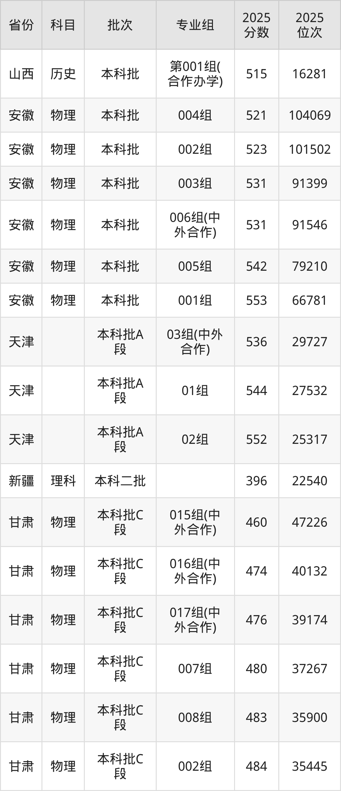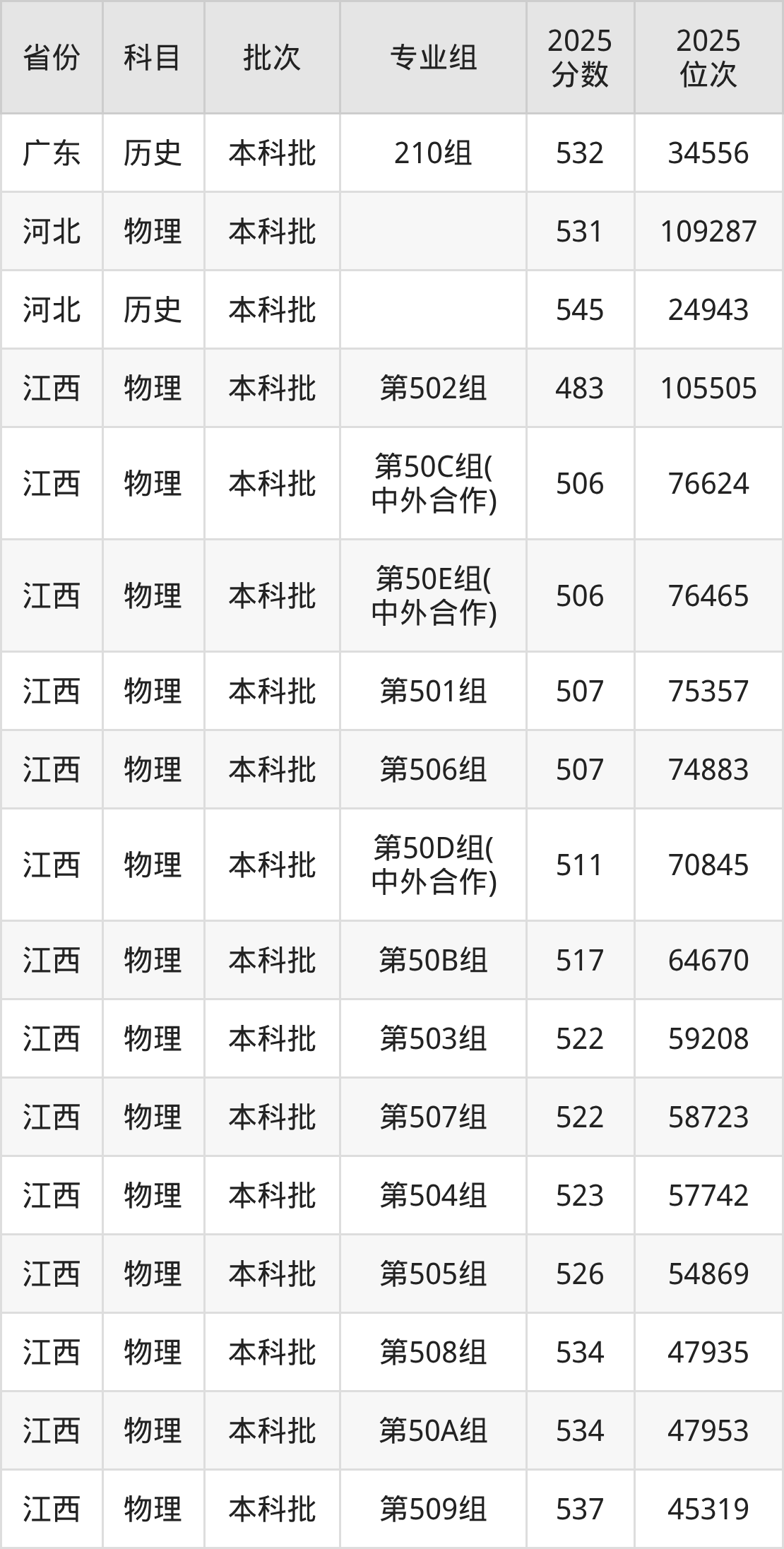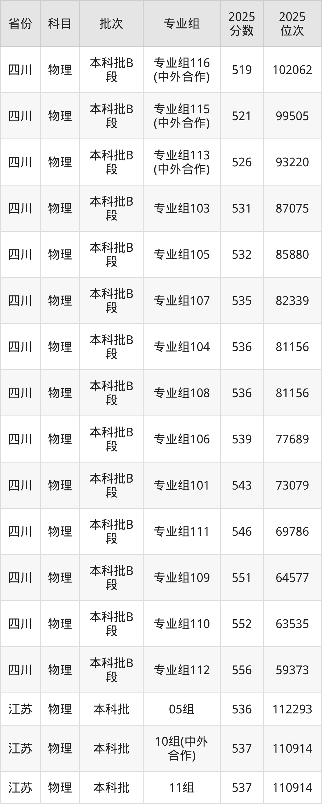 2025年在本科物理类进行招生,各专业组分数线详情如下: