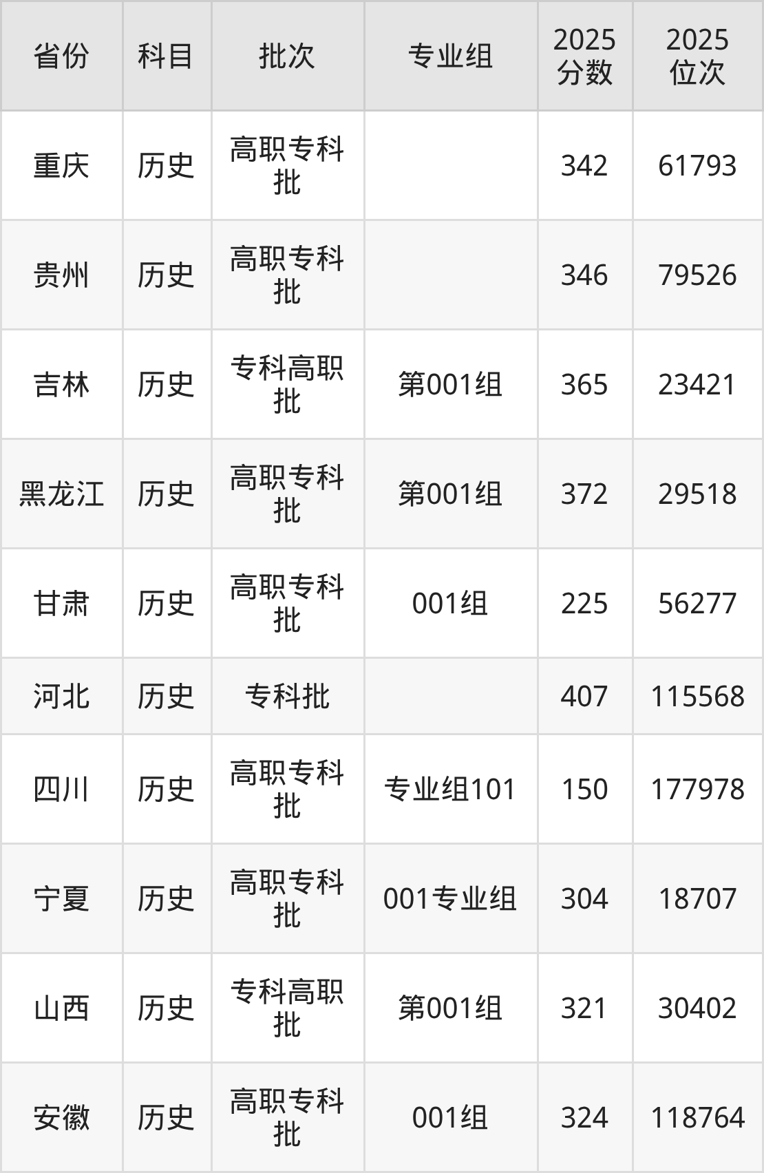 2025年在专科历史类进行招生,各专业组分数线详情如下: