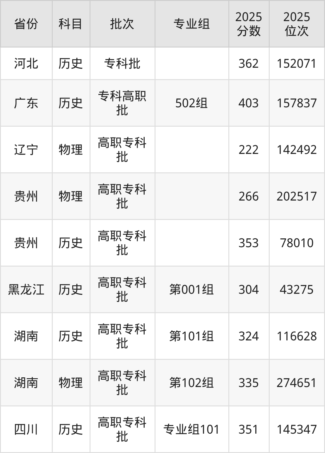 2025年在专科历史类进行招生,各专业组分数线详情如下: