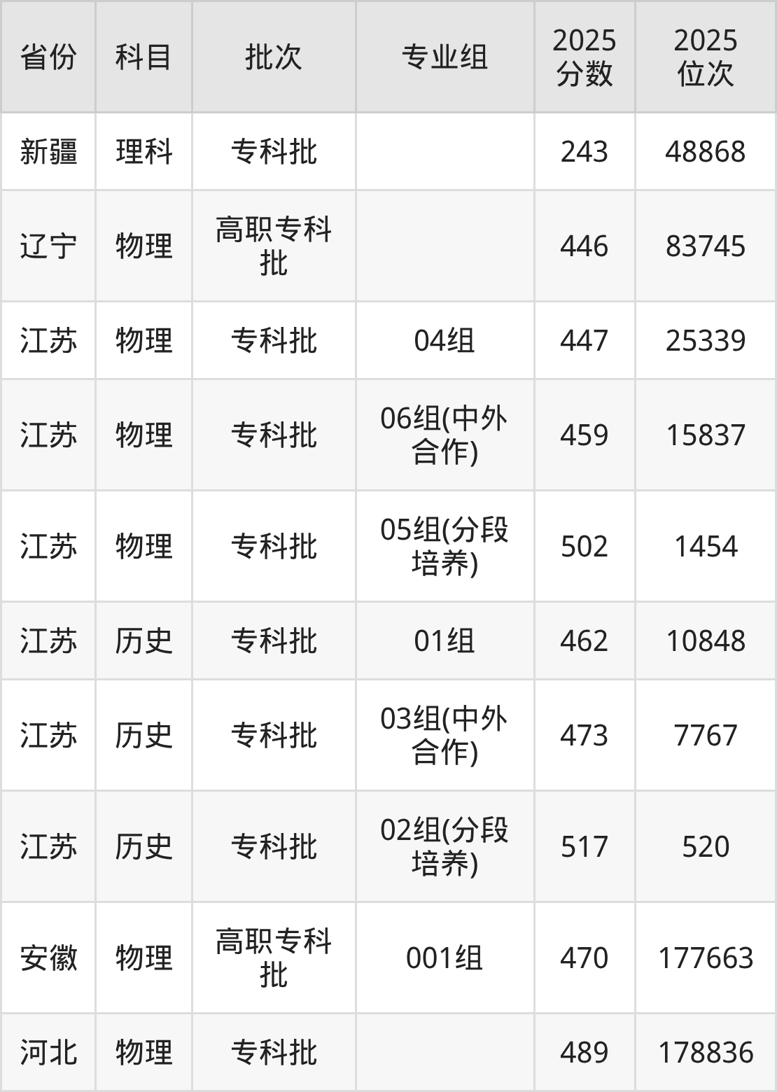 常州信息职业技术学院05组(分段培养项目):2025年投档录取最低分为502分,录取最低位次为1454名。