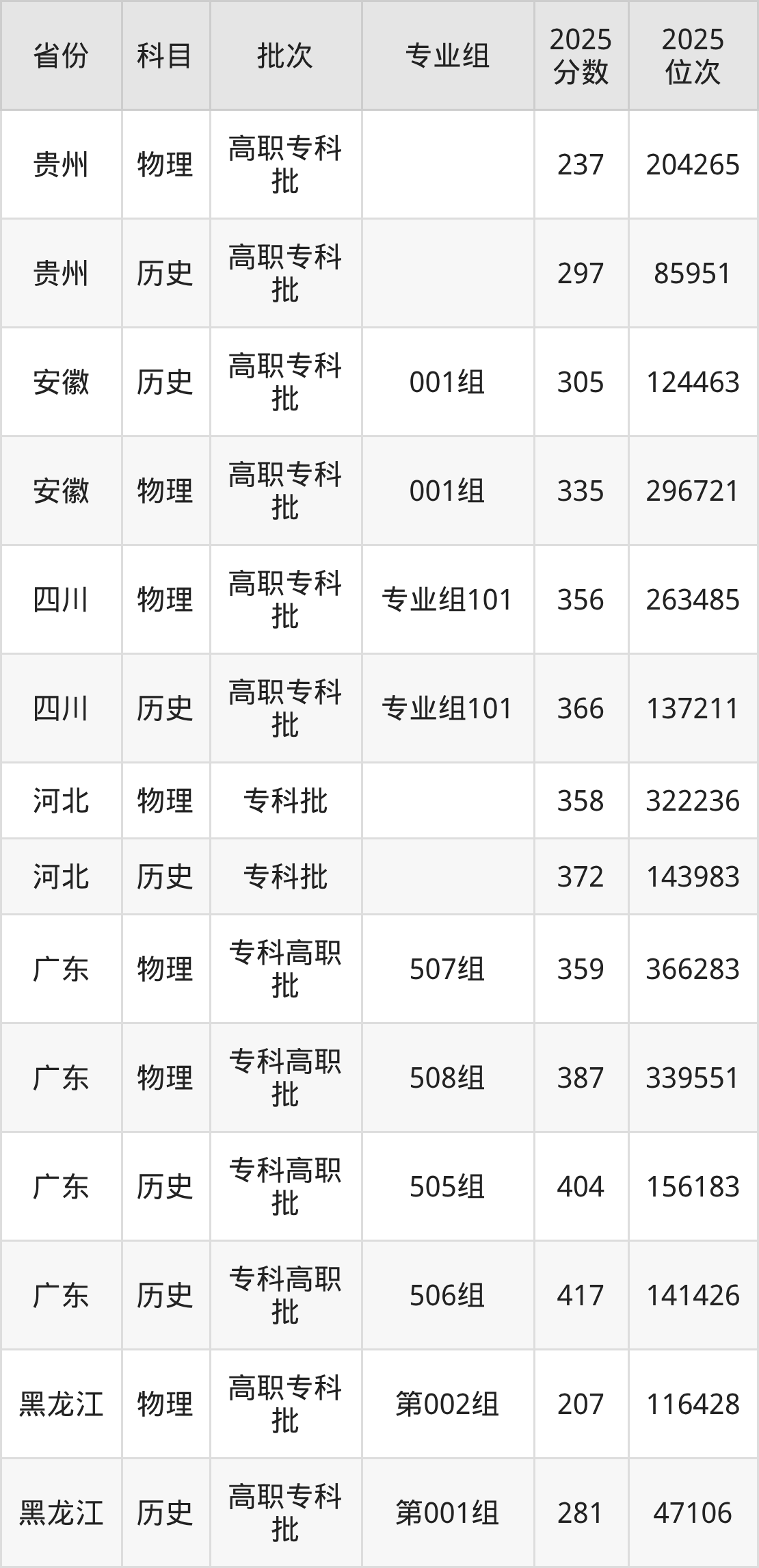 2025年广西安全工程职业技术学院全国录取分数线是207分到420分,录取最低在黑龙江物理类(第002组)、录取最高在河北历史类。各省各专业组最低分具有差异,详情如下: