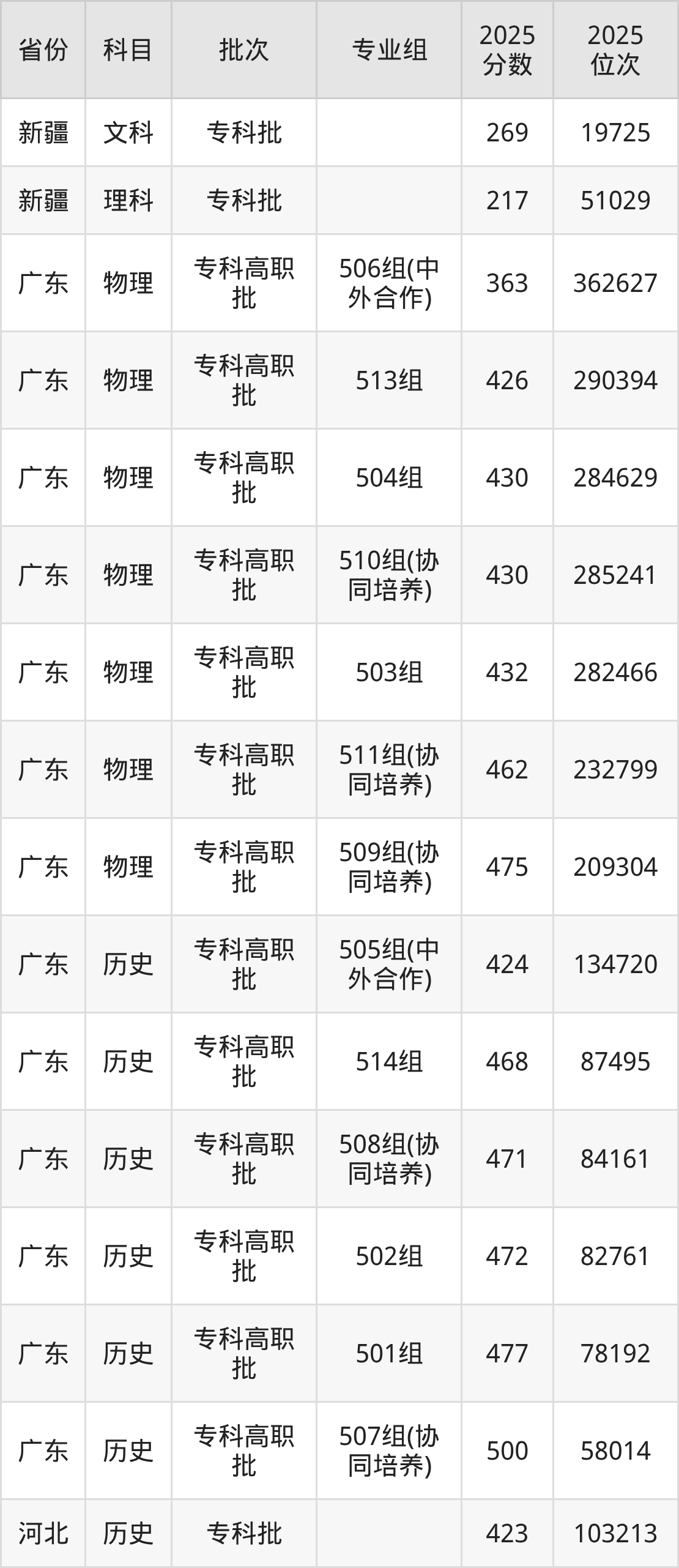 2025年广州城市职业学院全国录取分数线是217分到500分,录取最低在新疆理科、录取最高在广东历史类(507组(协同培养))。各省各专业组最低分具有差异,详情如下: