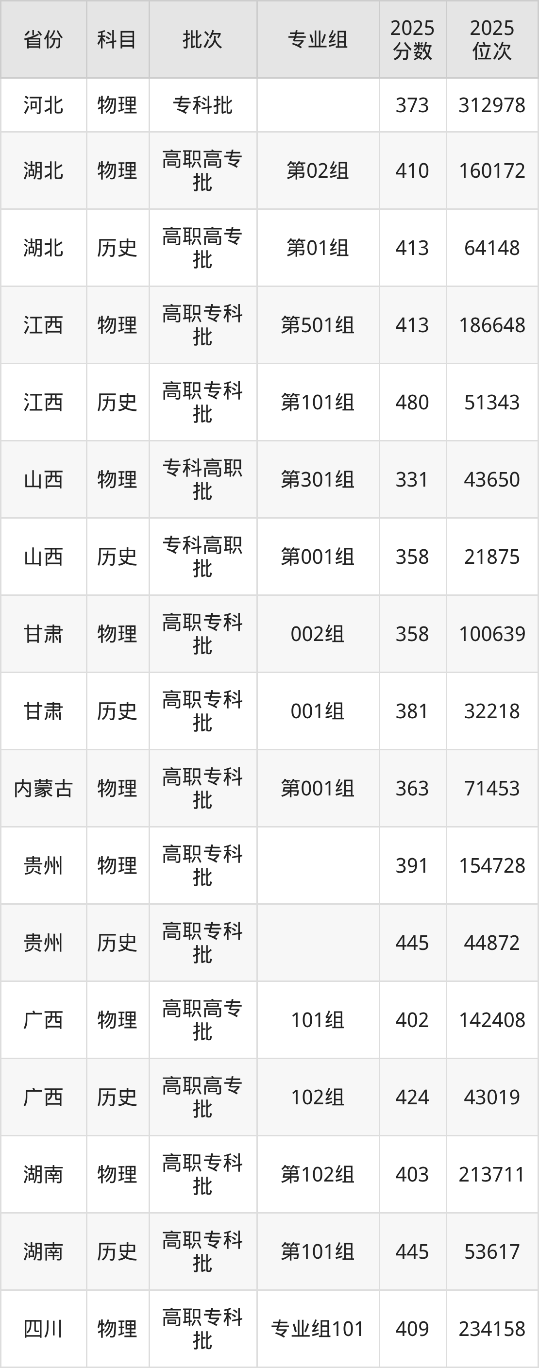 2025年在专科物理类进行招生,各专业组分数线详情如下: