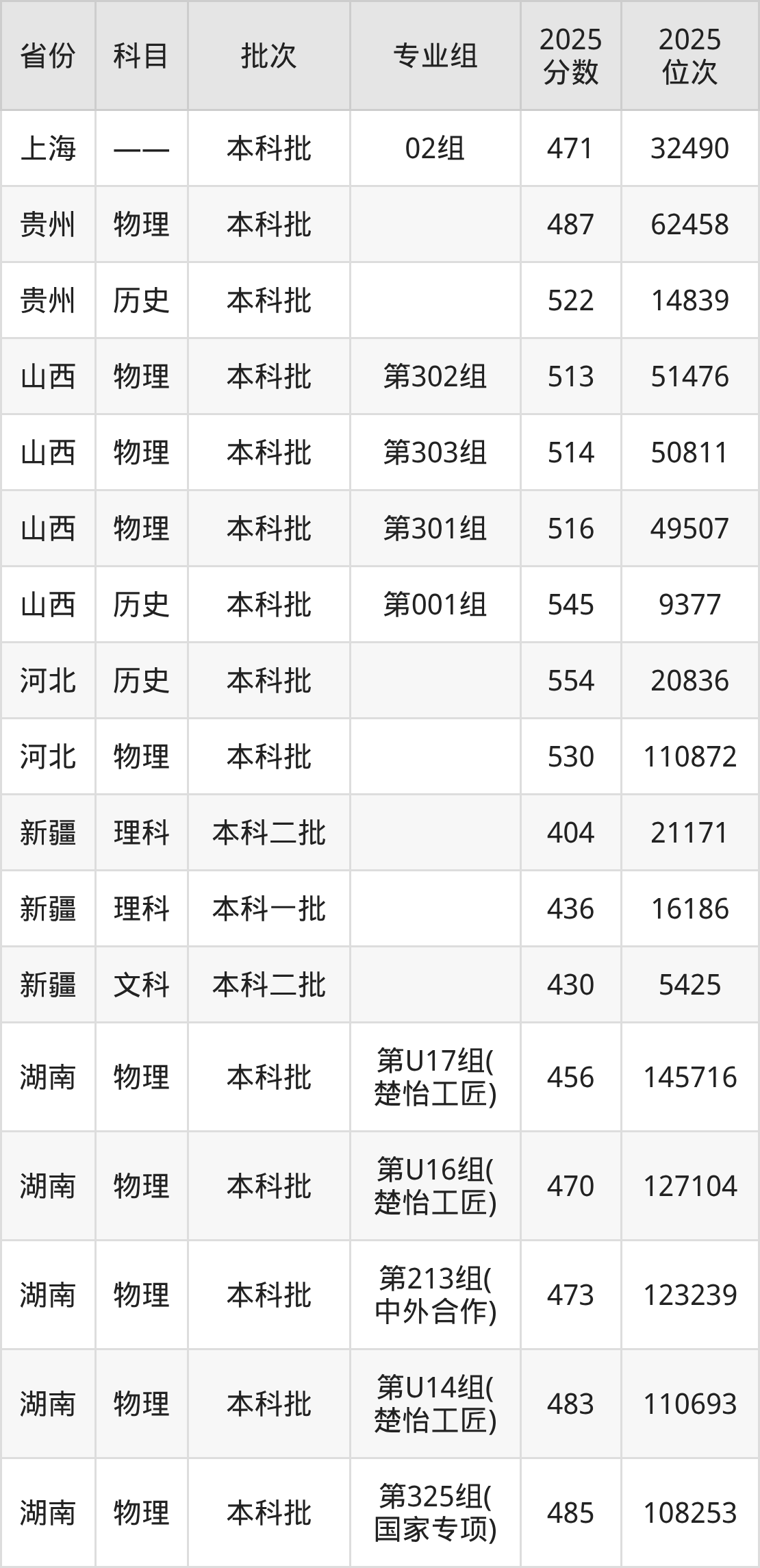 湖南农业大学第U16组(楚怡工匠):2025年投档录取最低分为470分,录取最低位次为127104名。