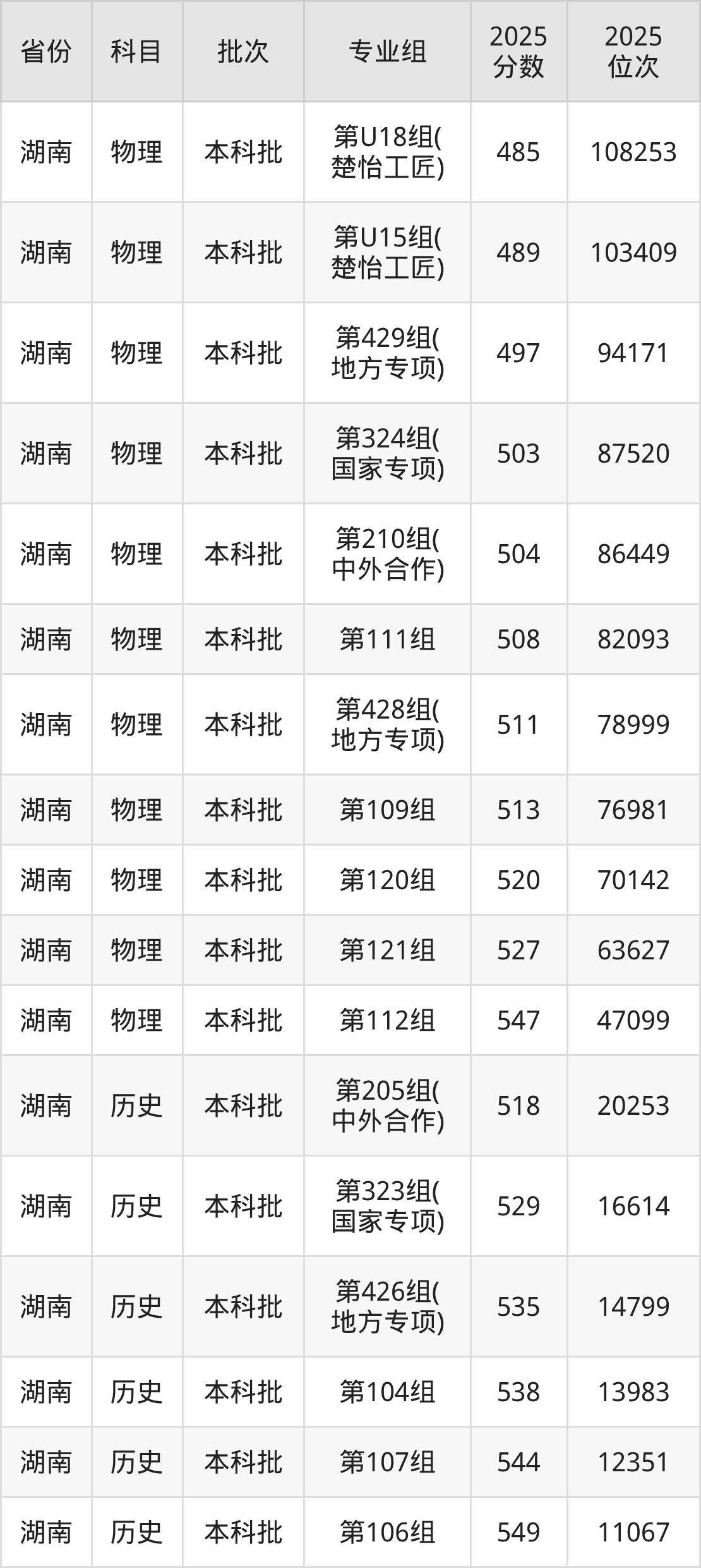 湖南农业大学第U18组(楚怡工匠):2025年投档录取最低分为485分,录取最低位次为108253名。