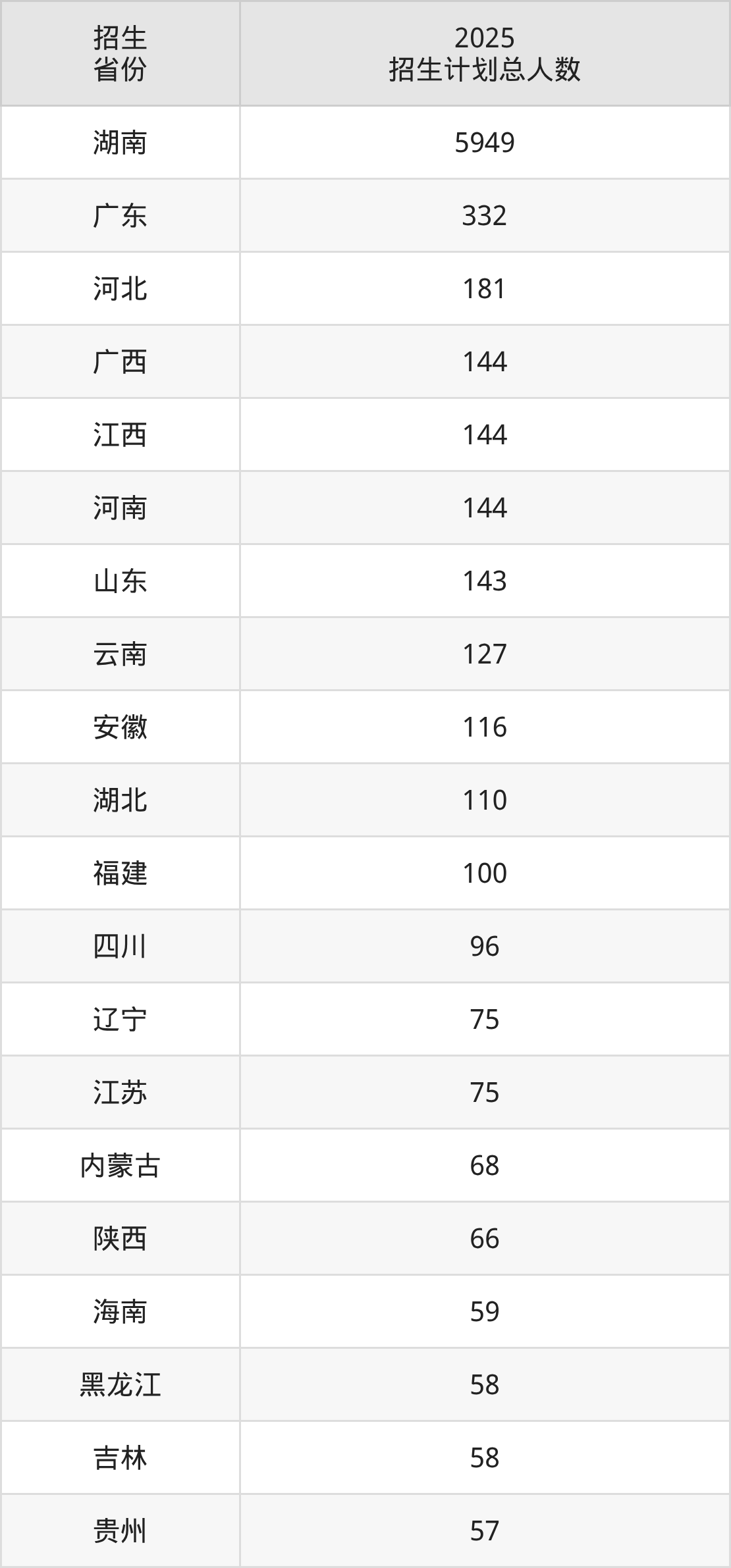 2025年湖南农业大学面向全国29个省市开展本科招生;招生专业共63个,招生人数共8432人。2025年在湖南省招生计划总人数是5949人,其中,湖南农业大学在湖南省招生人数最多的是动物科学。湖南农业大学在各省具体招生人数情况如下表。