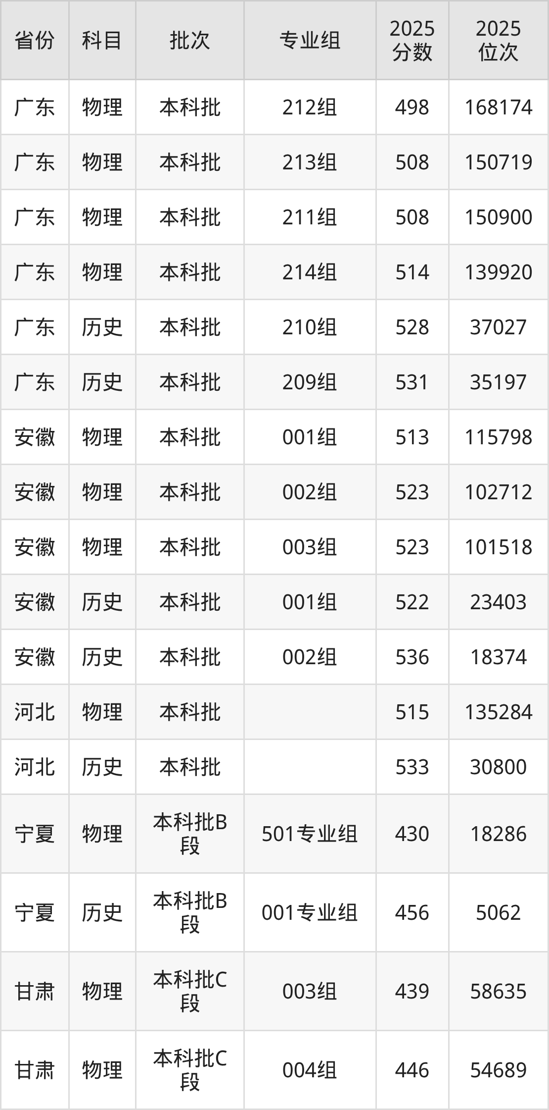 2025年在本科物理类进行招生,各专业组分数线详情如下: