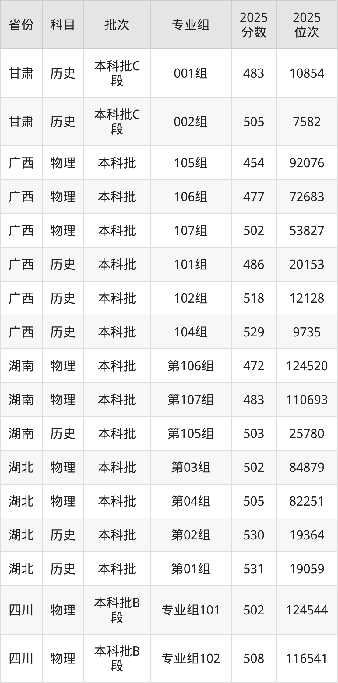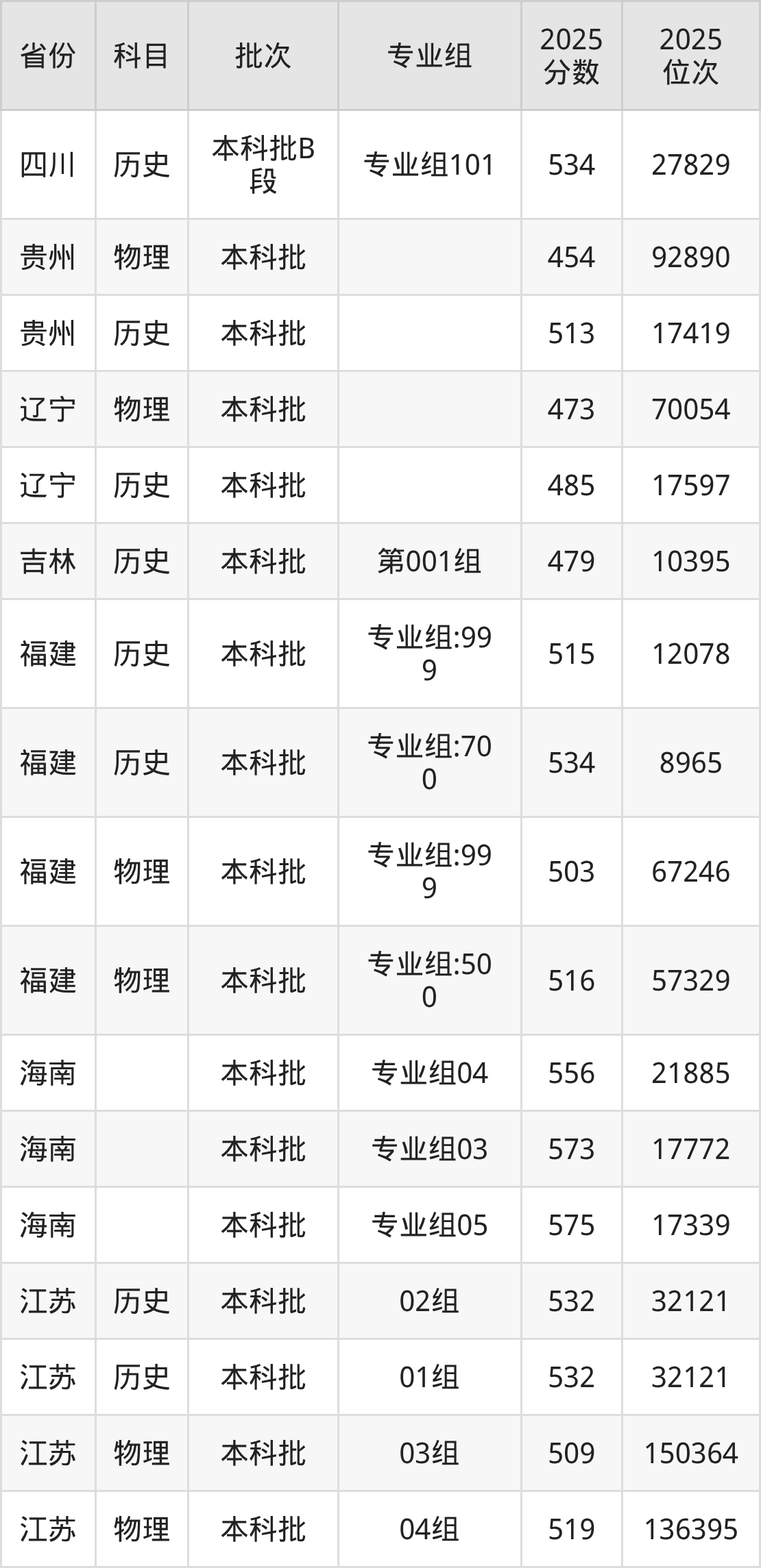 2025年在本科历史类进行招生,各专业组分数线详情如下: