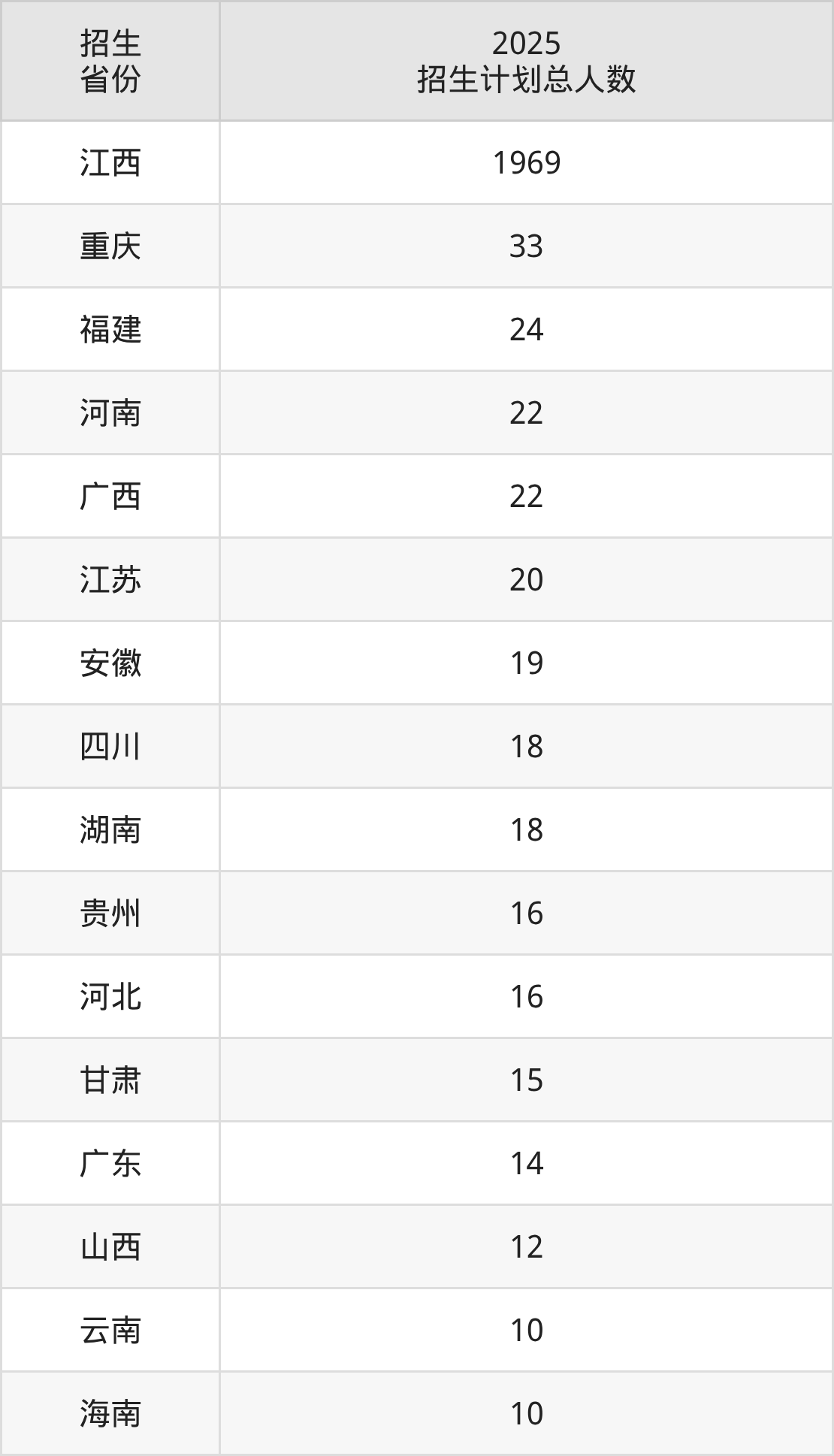 2025年南昌师范学院面向全国24个省市开展本科招生;招生专业共23个,招生人数共2276人。2025年在江西省招生计划总人数是1969人,其中,南昌师范学院在江西省招生人数最多的是汉语言文学。南昌师范学院在各省具体招生人数情况如下表。