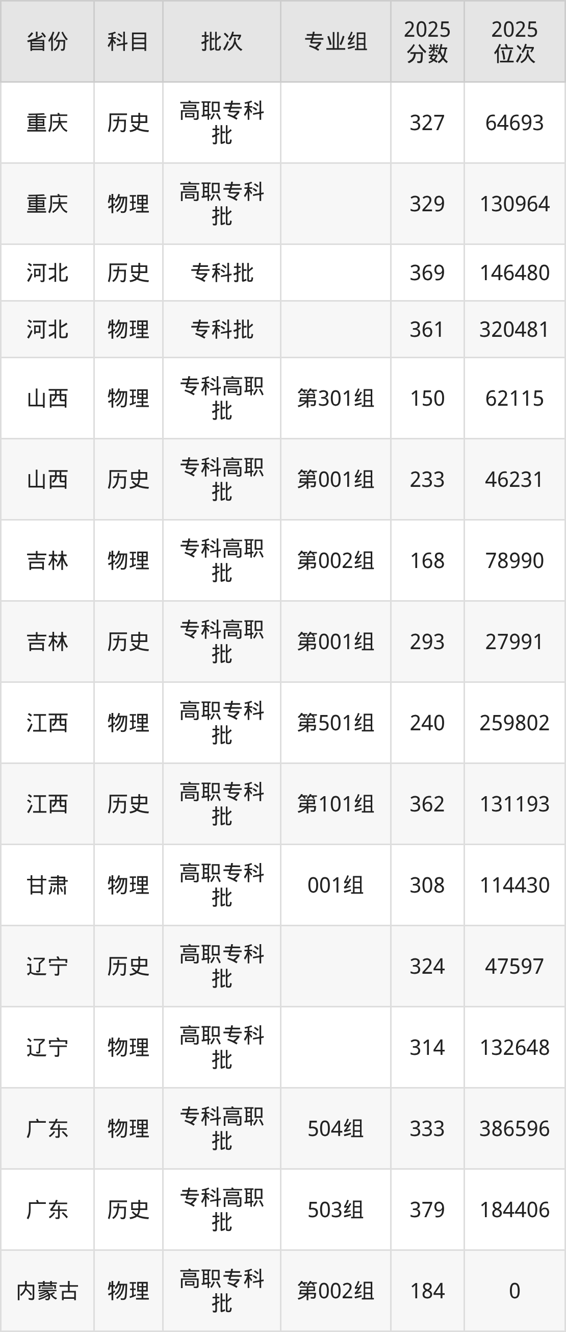 普通类专科物理类最低168分,专科历史类最低293分