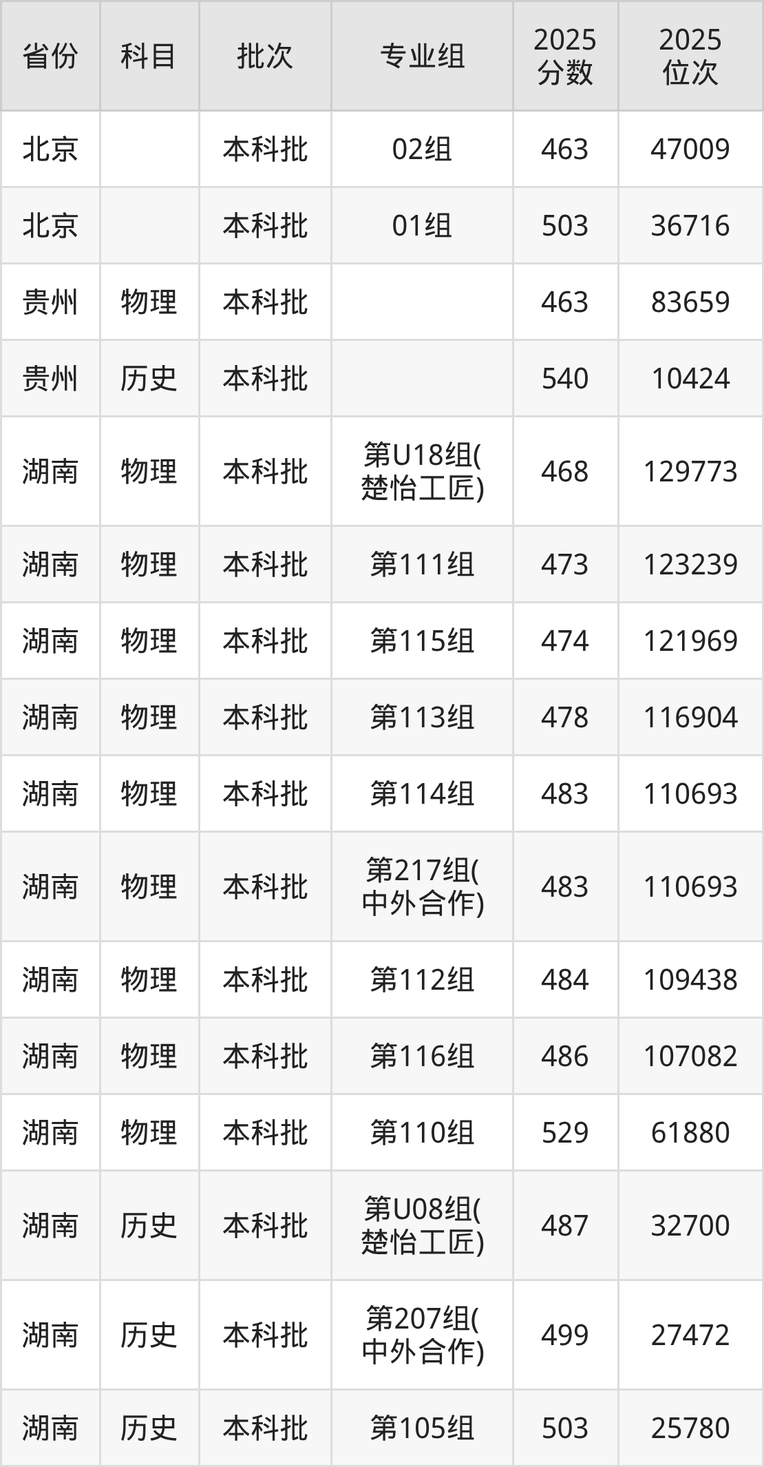 湖南财政经济学院第U18组(楚怡工匠):2025年投档录取最低分为468分,录取最低位次为129773名。