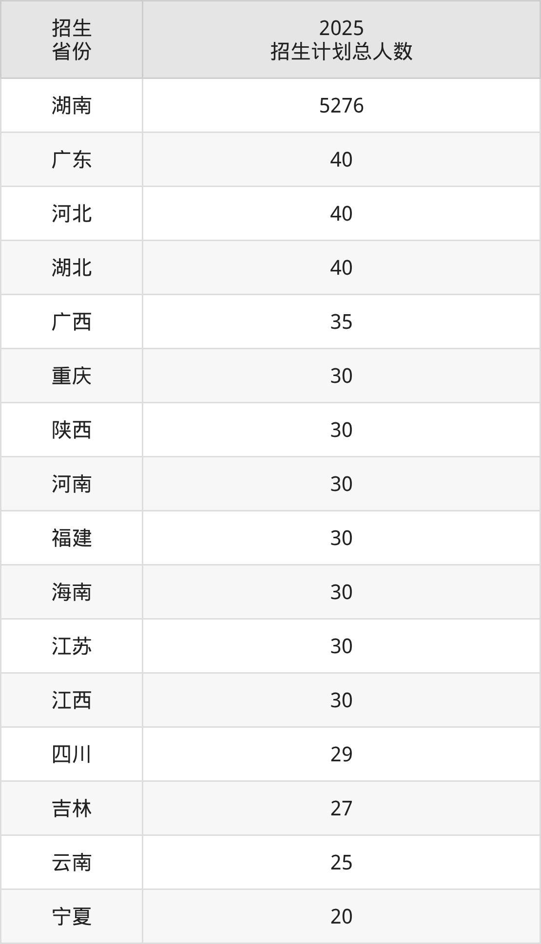 2025年湖南财政经济学院面向全国27个省市开展本科招生;招生专业共44个,招生人数共5890人。2025年在湖南省招生计划总人数是5276人,其中,湖南财政经济学院在湖南省招生人数最多的是计算机科学与技术。湖南财政经济学院在各省具体招生人数情况如下表。