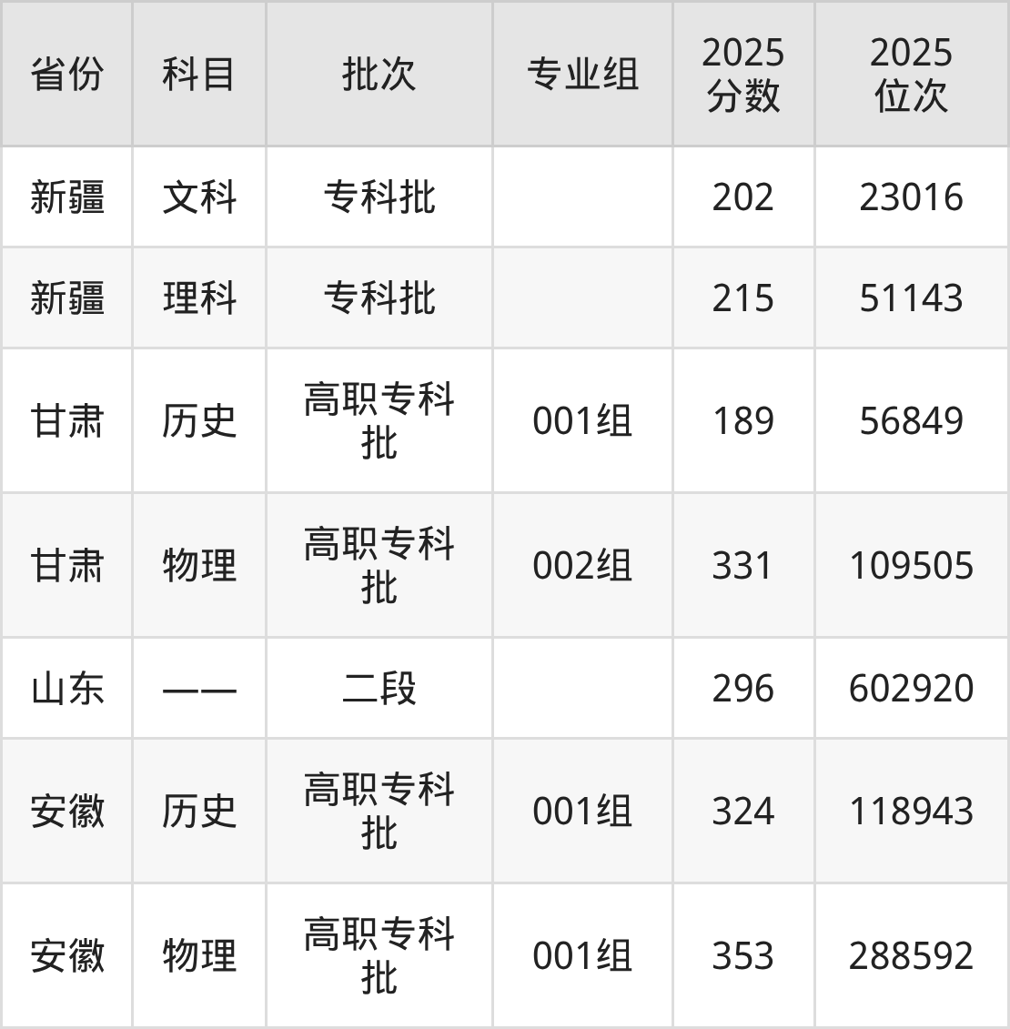 临沂职业学院001专业组:2025年投档录取最低分为189分,录取最低位次为56849名。