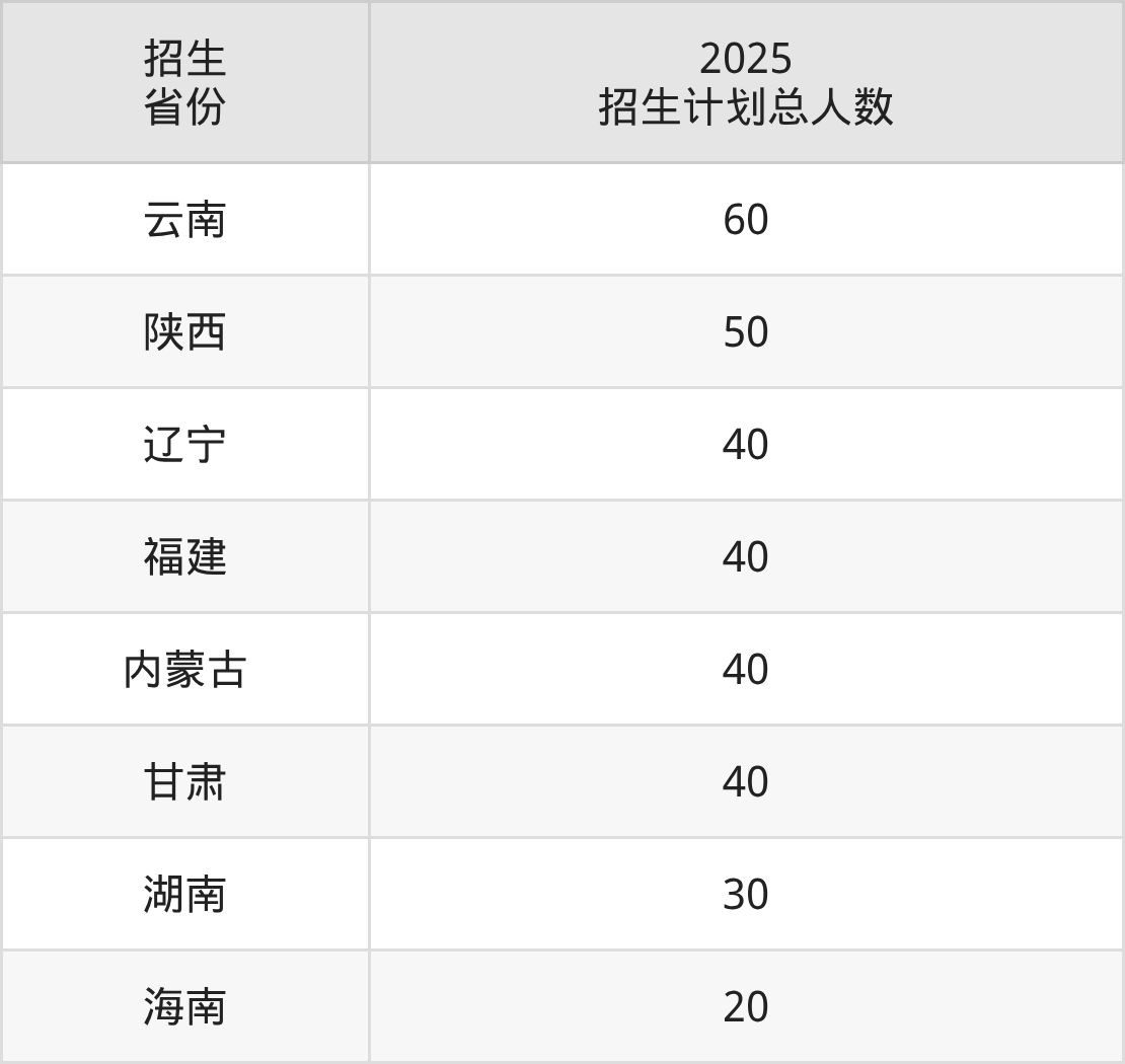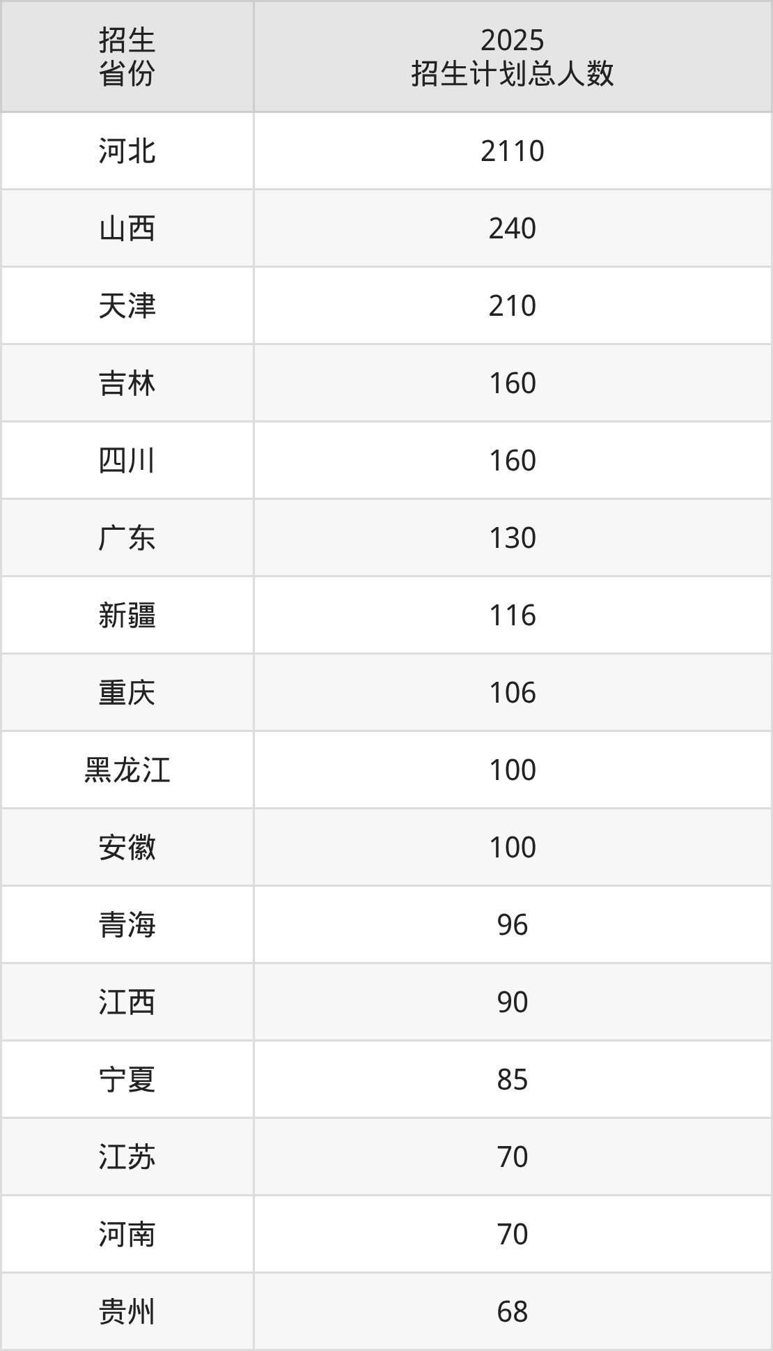 2025年石家庄医学高等专科学校面向全国24个省市开展专科招生;招生专业共22个,招生人数共4231人。2025年在河北省招生计划总人数是2110人,其中,石家庄医学高等专科学校在河北省招生人数最多的是护理。石家庄医学高等专科学校在各省具体招生人数情况如下表。