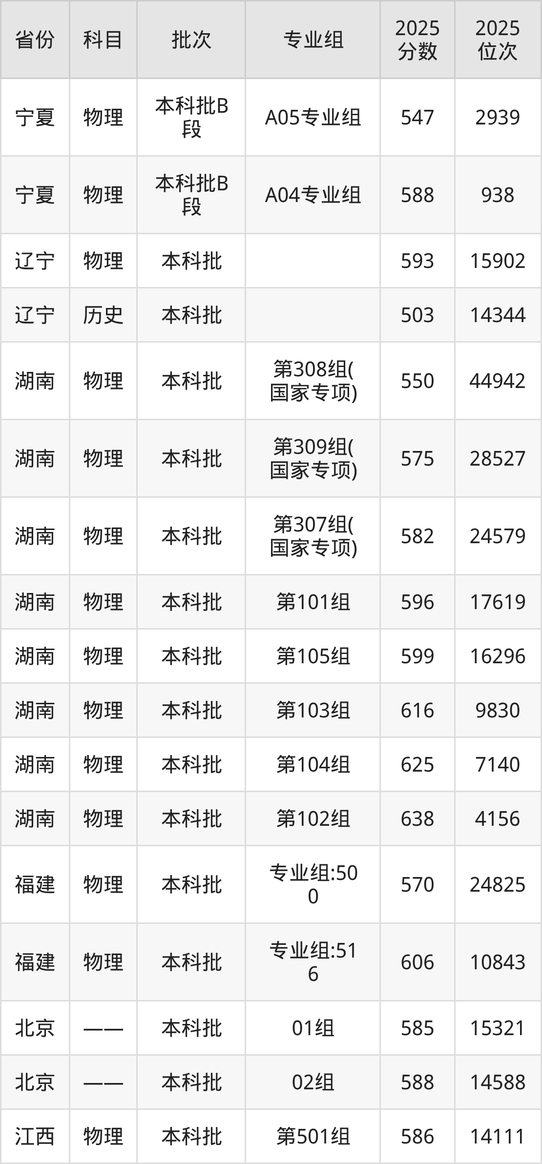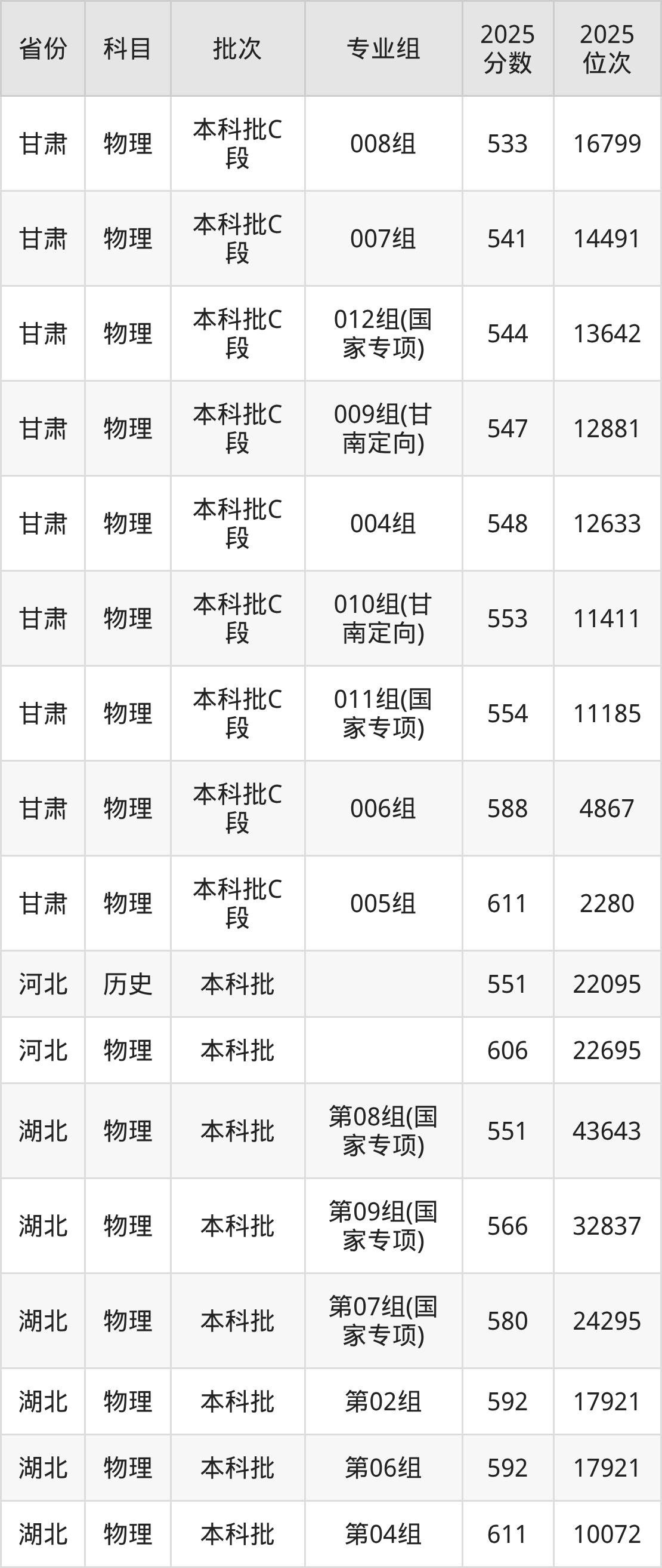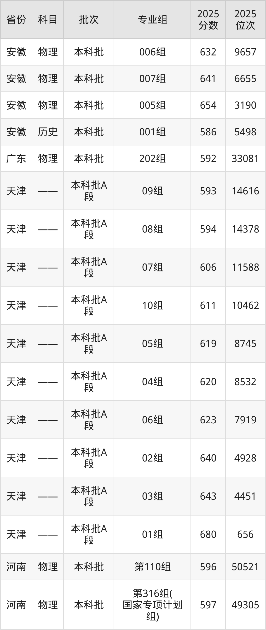 2025年在本科物理类进行招生,各专业组分数线详情如下:
