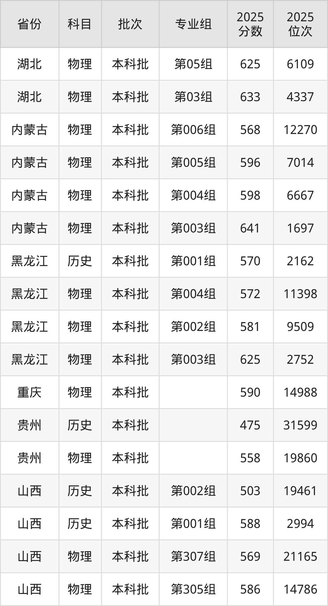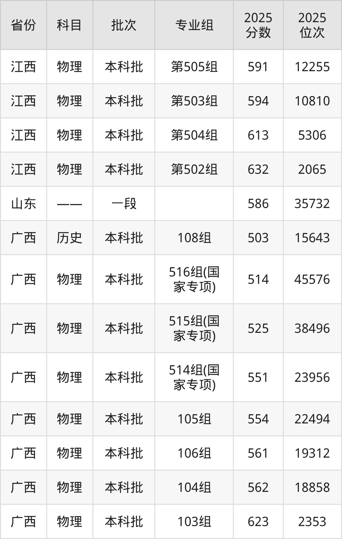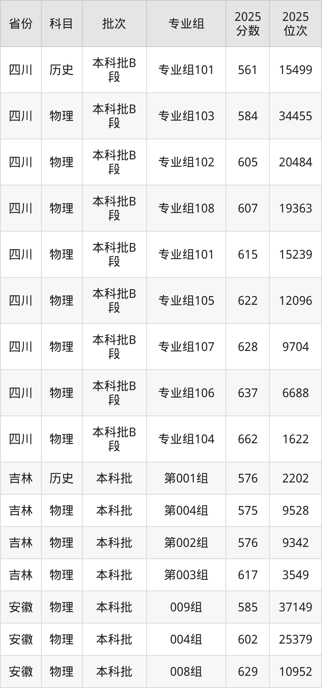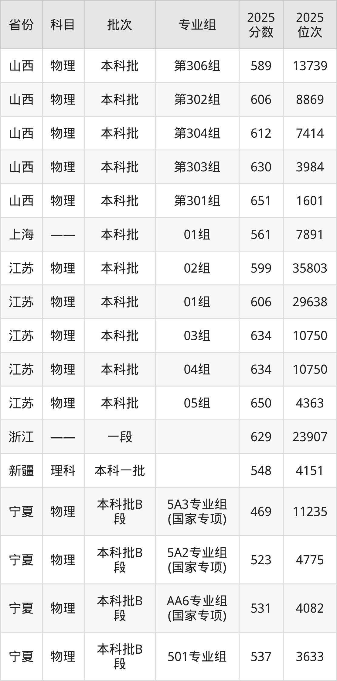 2025年在本科物理类进行招生,各专业组分数线详情如下: