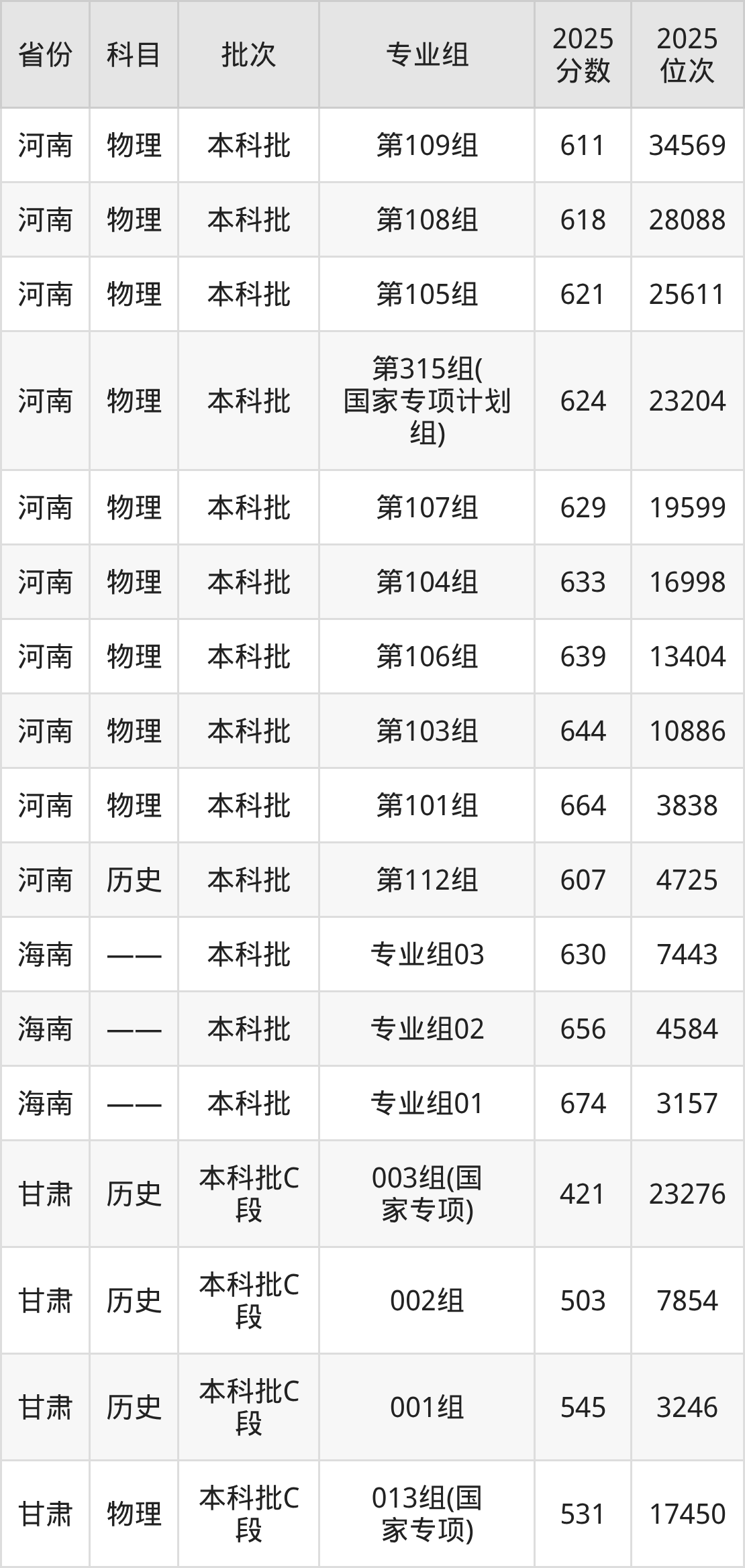 2025年在本科理科进行招生,各专业组分数线详情如下: