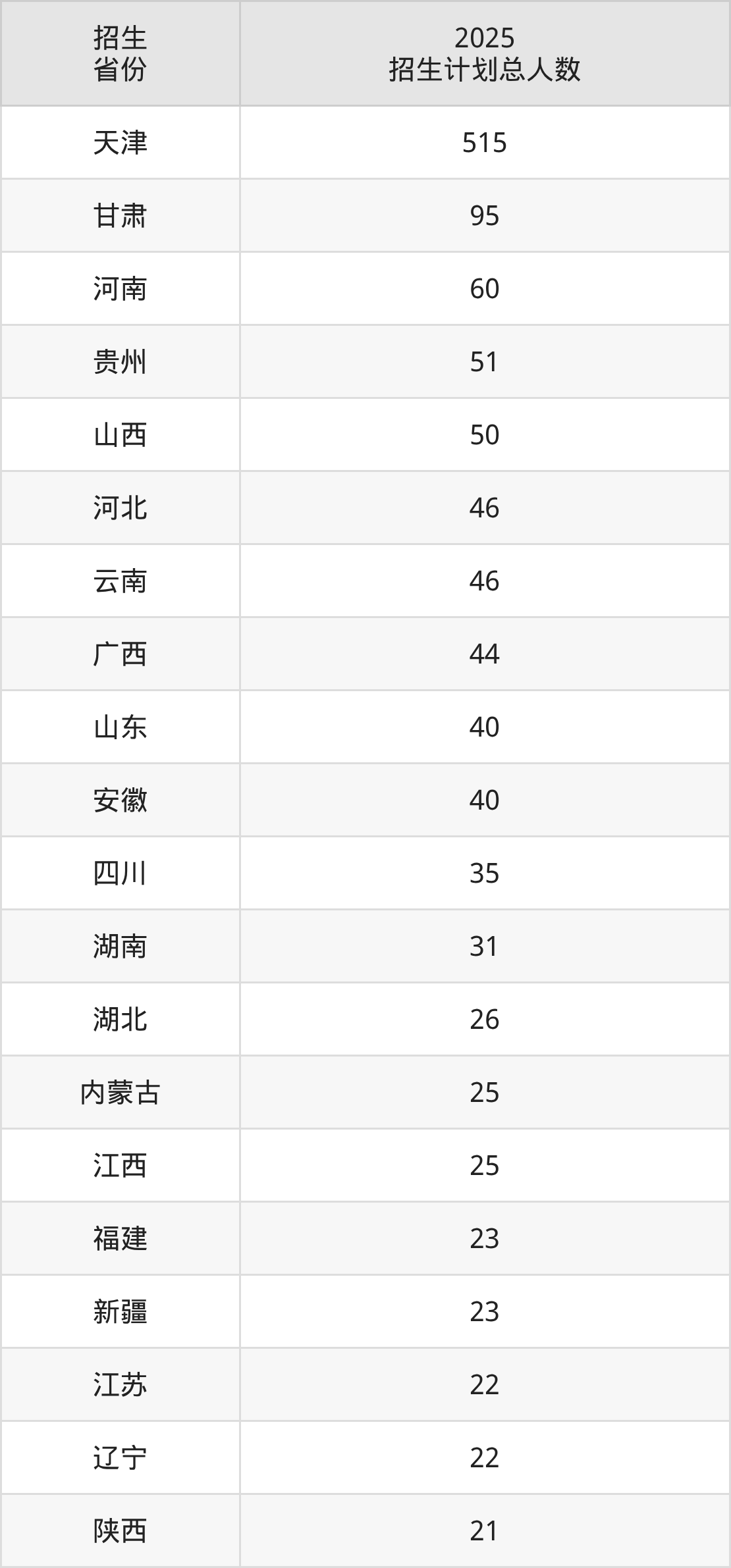 2025年天津医科大学面向全国28个省市开展本科招生;招生专业共20个,招生人数共1352人。2025年在天津市招生计划总人数是515人,其中,天津医科大学在天津市招生人数最多的是护理学。天津医科大学在各省具体招生人数情况如下表。