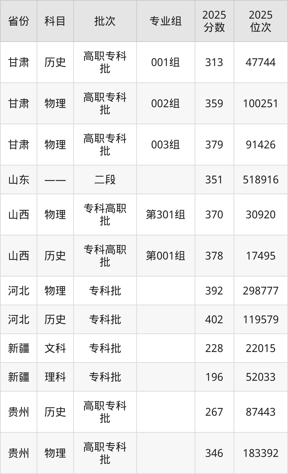 山东电子职业技术学院第001组:2025年投档录取最低分为378分,录取最低位次为17495名。