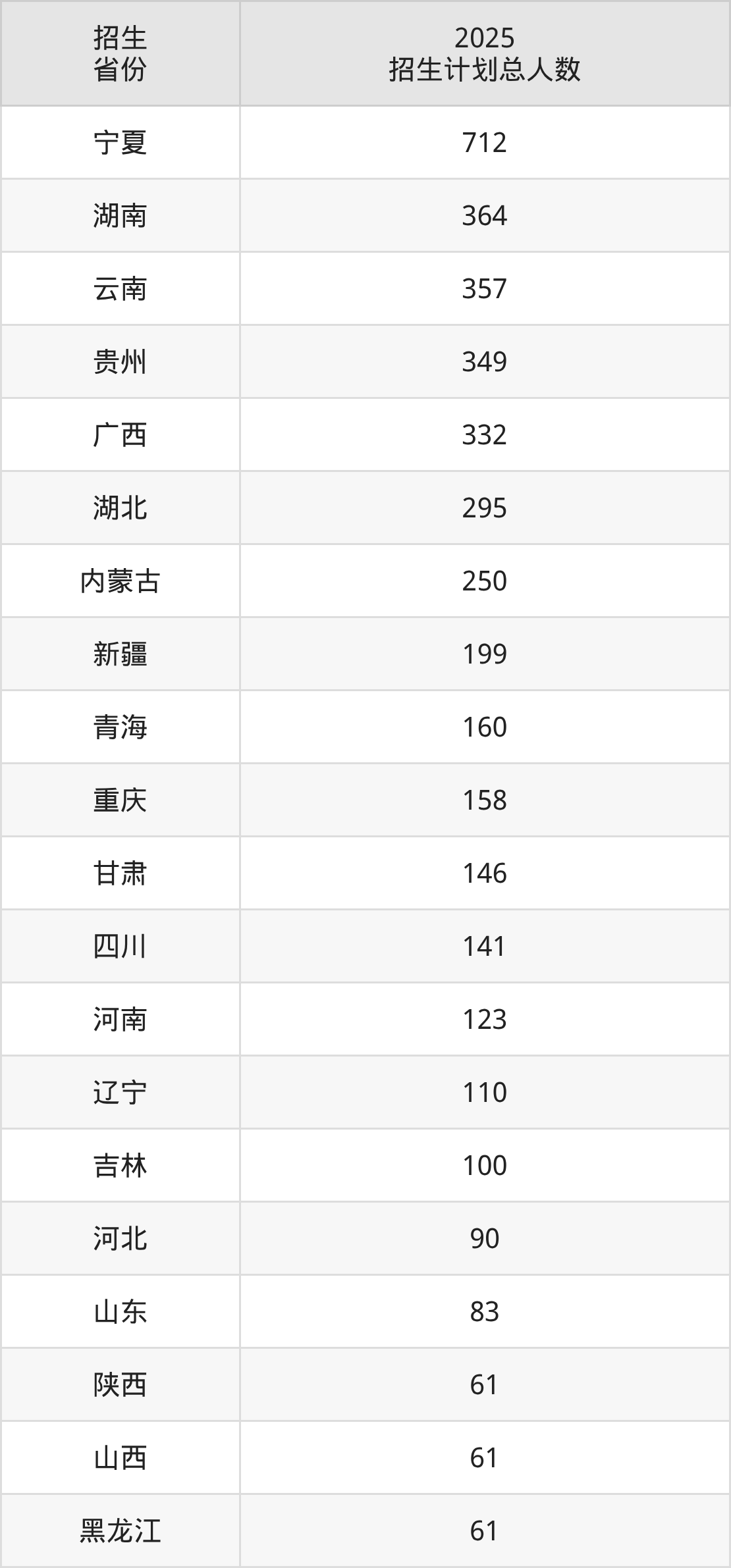 2025年北方民族大学面向全国29个省市开展本科招生;招生专业共42个,招生人数共4369人。2025年在宁夏回族自治区招生计划总人数是712人,其中,北方民族大学在宁夏回族自治区招生人数最多的是化工与制药类。北方民族大学在各省具体招生人数情况如下表。