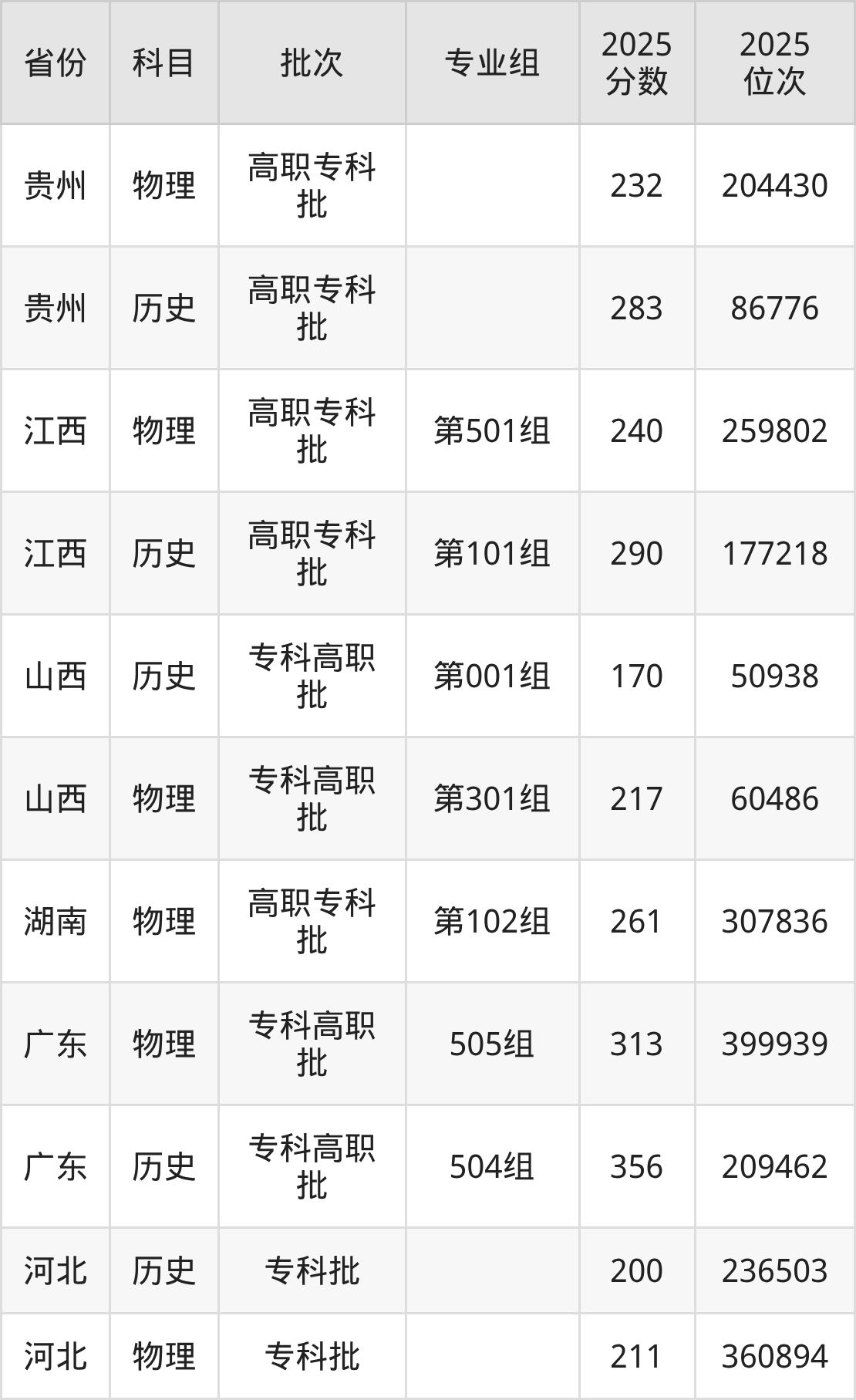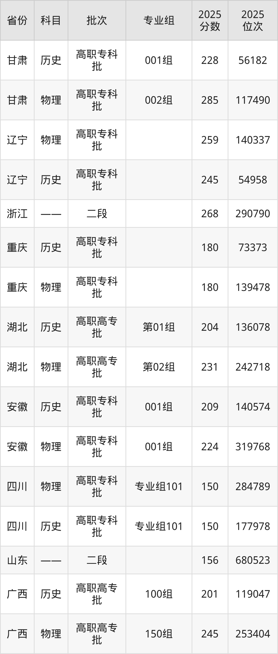 2025年在专科物理类进行招生,各专业组分数线详情如下: