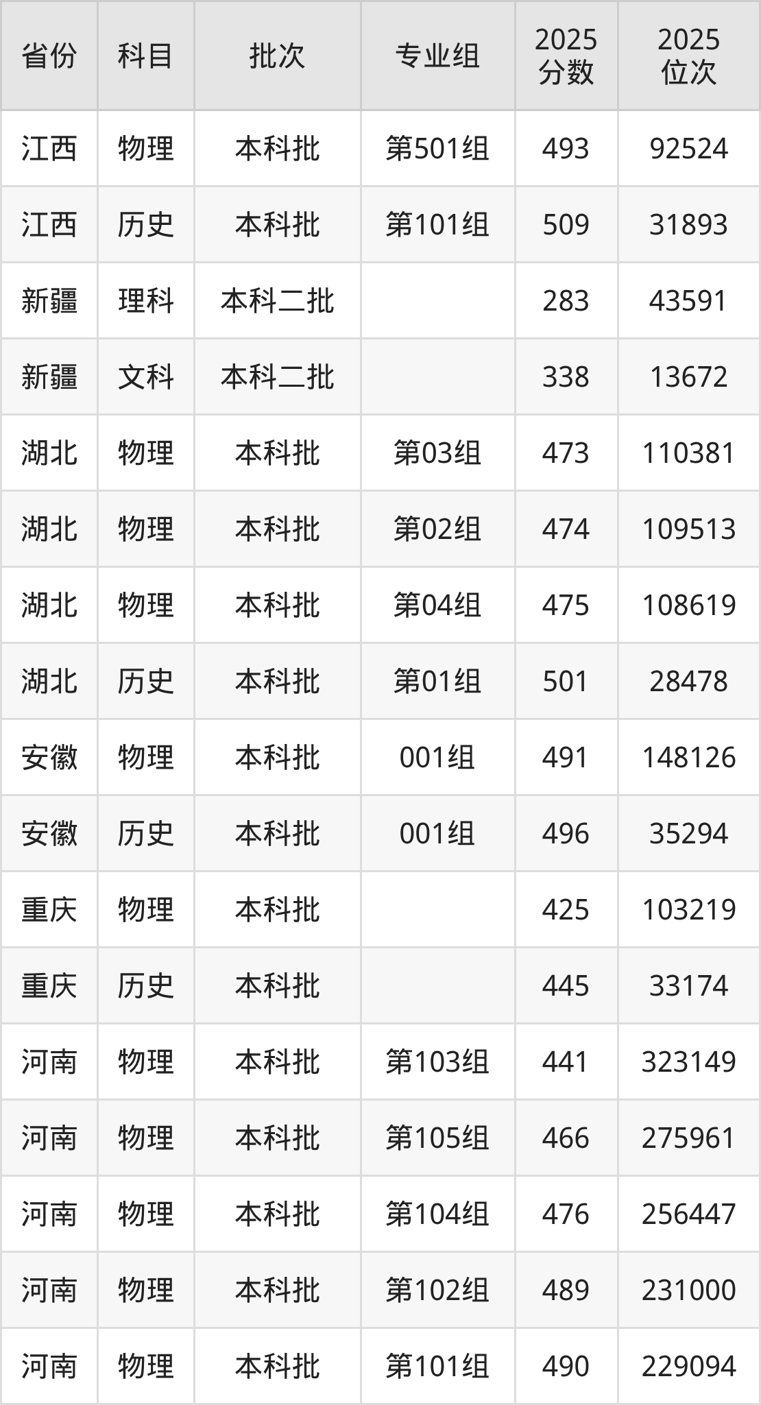 2025年重庆工程学院全国录取分数线是283分到549分,录取最低在新疆理科、录取最高在海南(专业组01)。各省各专业组最低分具有差异,详情如下: