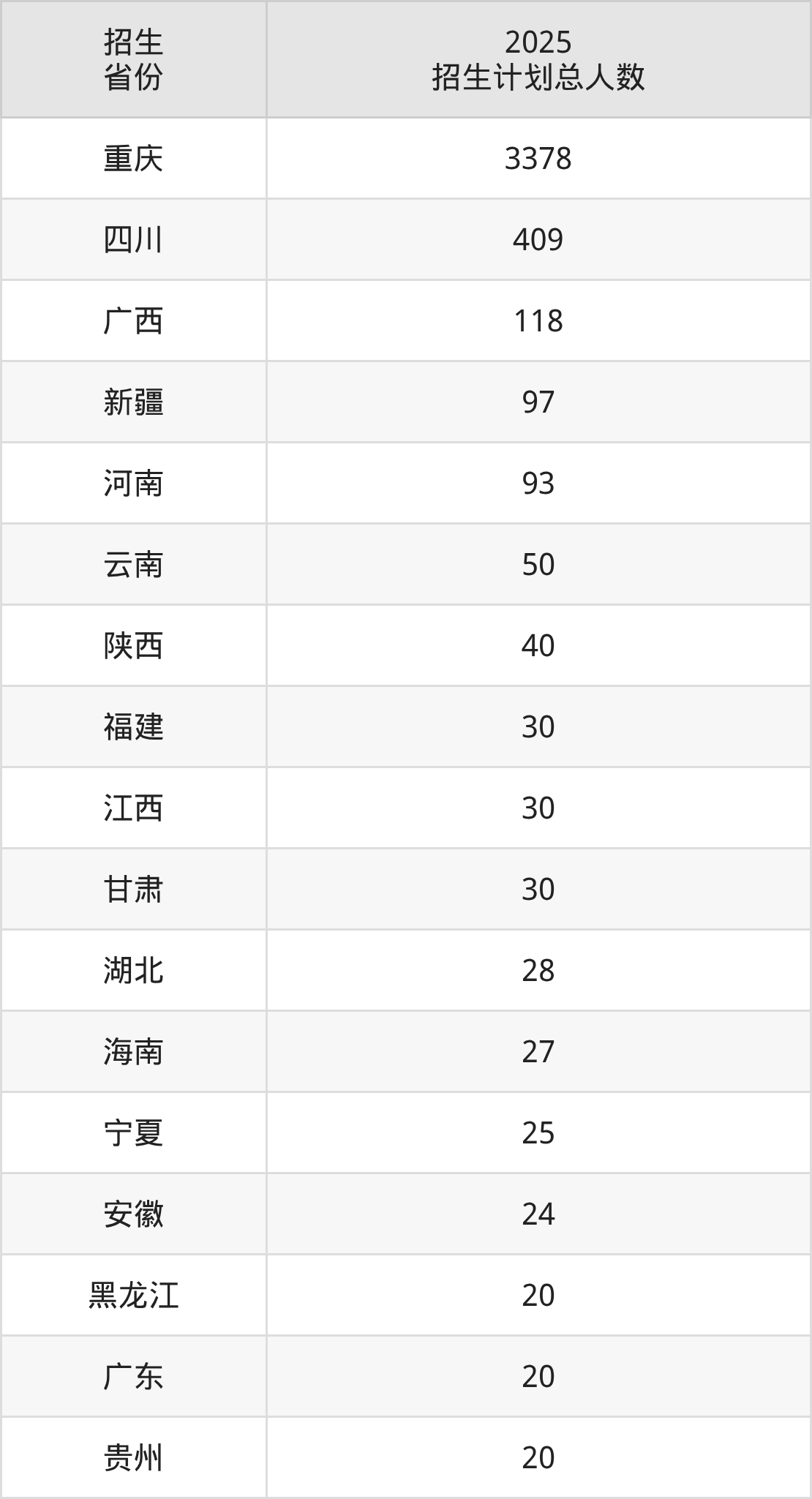 2025年重庆工程学院面向全国17个省市开展本科招生;招生专业共14个,招生人数共4439人。2025年在重庆市招生计划总人数是3378人,其中,重庆工程学院在重庆市招生人数最多的是计算机类。重庆工程学院在各省具体招生人数情况如下表。