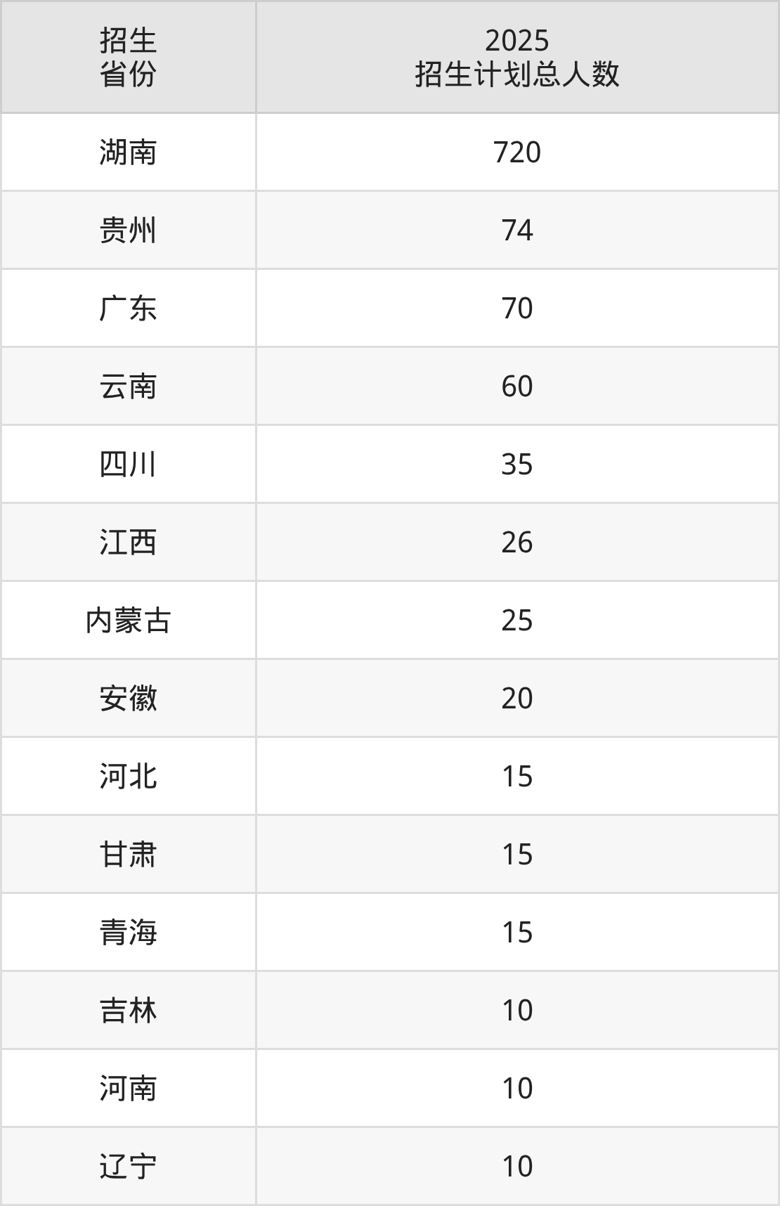 2025年湖南水利水电职业技术学院面向全国14个省市开展专科招生;招生专业共25个,招生人数共1105人。2025年在湖南省招生计划总人数是720人,其中,湖南水利水电职业技术学院在湖南省招生人数最多的是电力系统自动化技术。湖南水利水电职业技术学院在各省具体招生人数情况如下表。