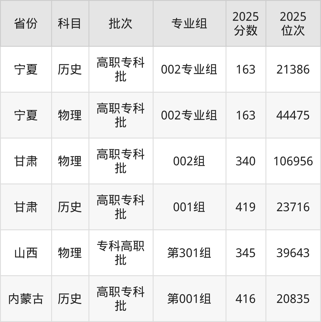 宁夏财经职业技术学院002专业组:2025年投档录取最低分为340分,录取最低位次为106956名。