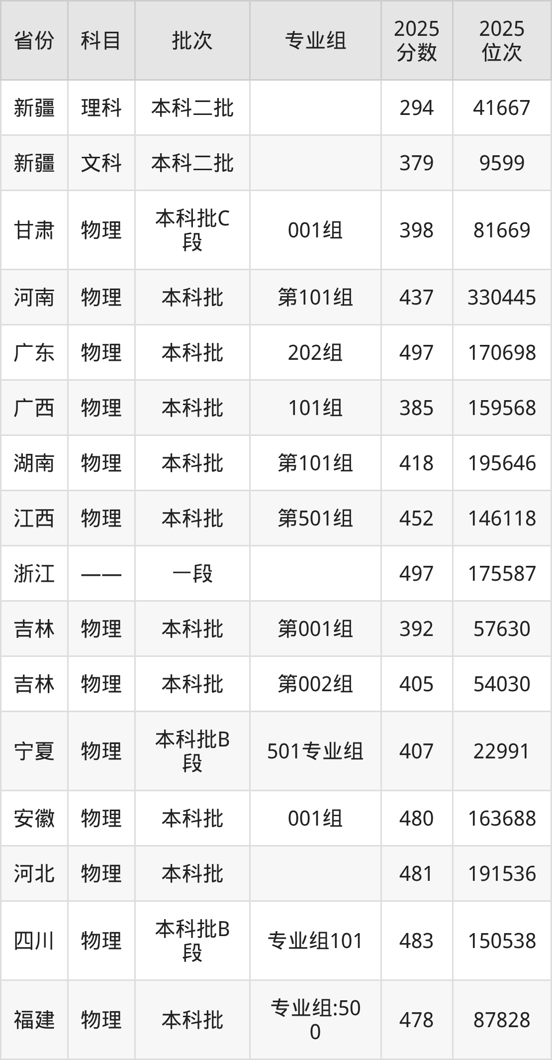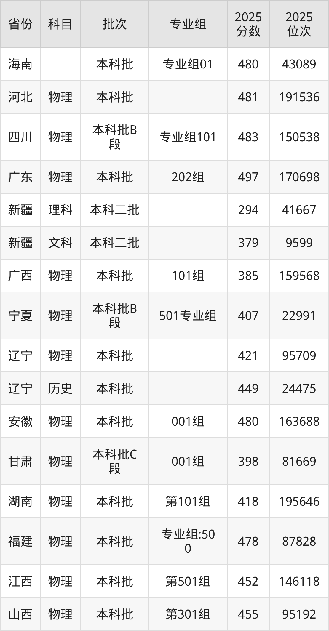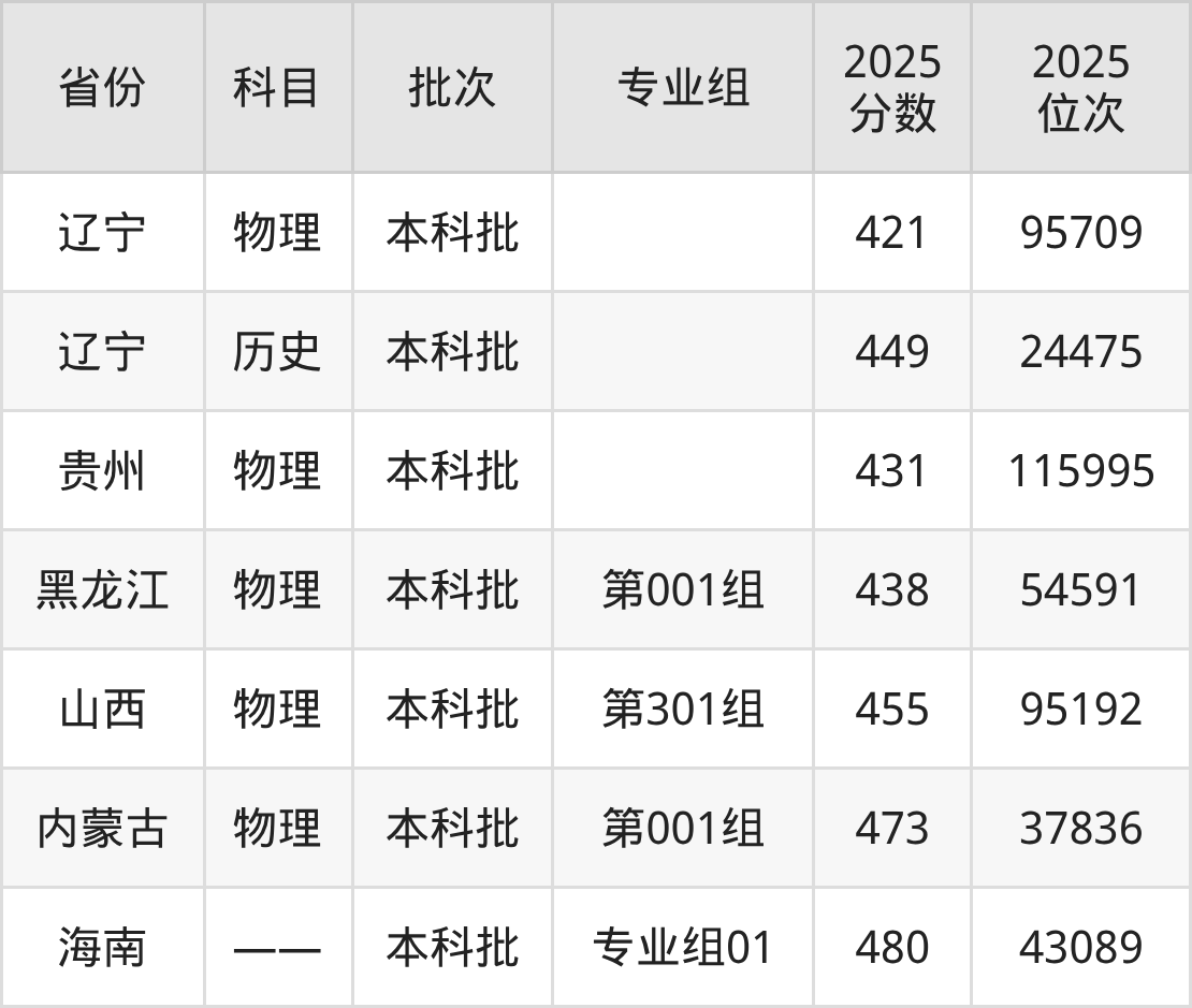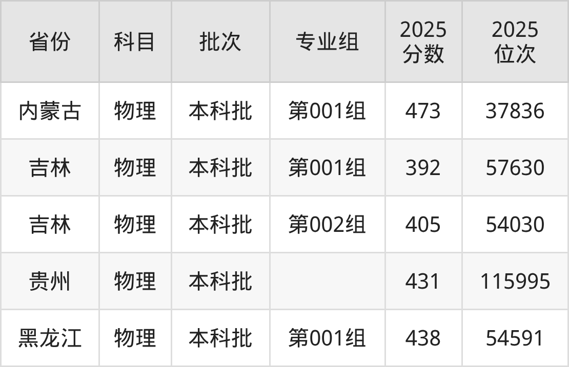 2025年在本科物理类进行招生,各专业组分数线详情如下: