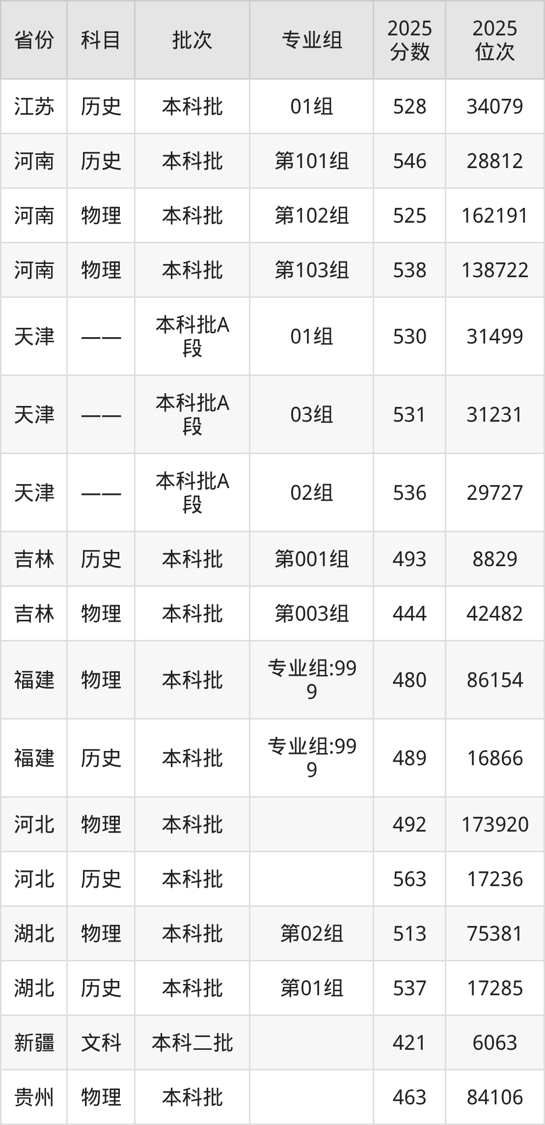 2025年在本科文科进行招生,各专业组分数线详情如下: