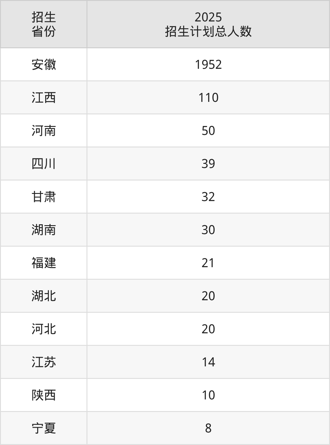 2025年池州学院面向全国12个省市开展本科招生;招生专业共42个,招生人数共2306人。2025年在安徽省招生计划总人数是1952人,其中,池州学院在安徽省招生人数最多的是汉语言文学。池州学院在各省具体招生人数情况如下表。