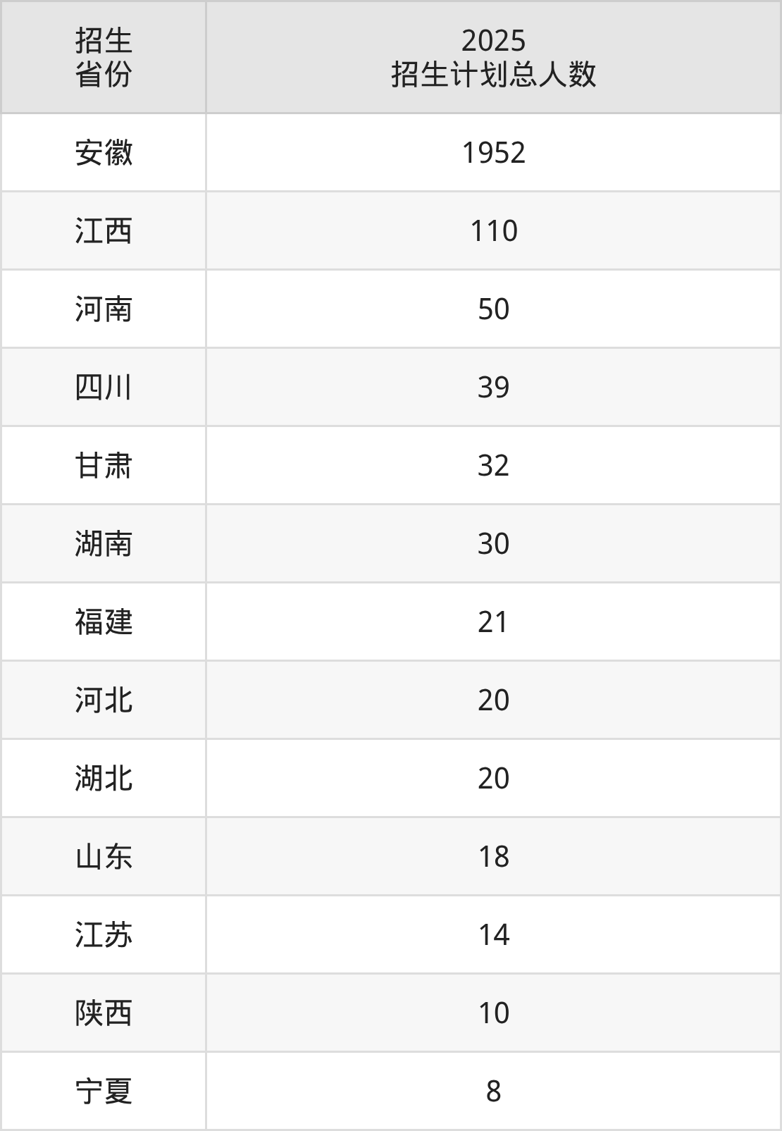 2025年池州学院面向全国13个省市开展本科招生;招生专业共42个,招生人数共2324人。2025年在安徽省招生计划总人数是1952人,其中,池州学院在安徽省招生人数最多的是汉语言文学。池州学院在各省具体招生人数情况如下表。