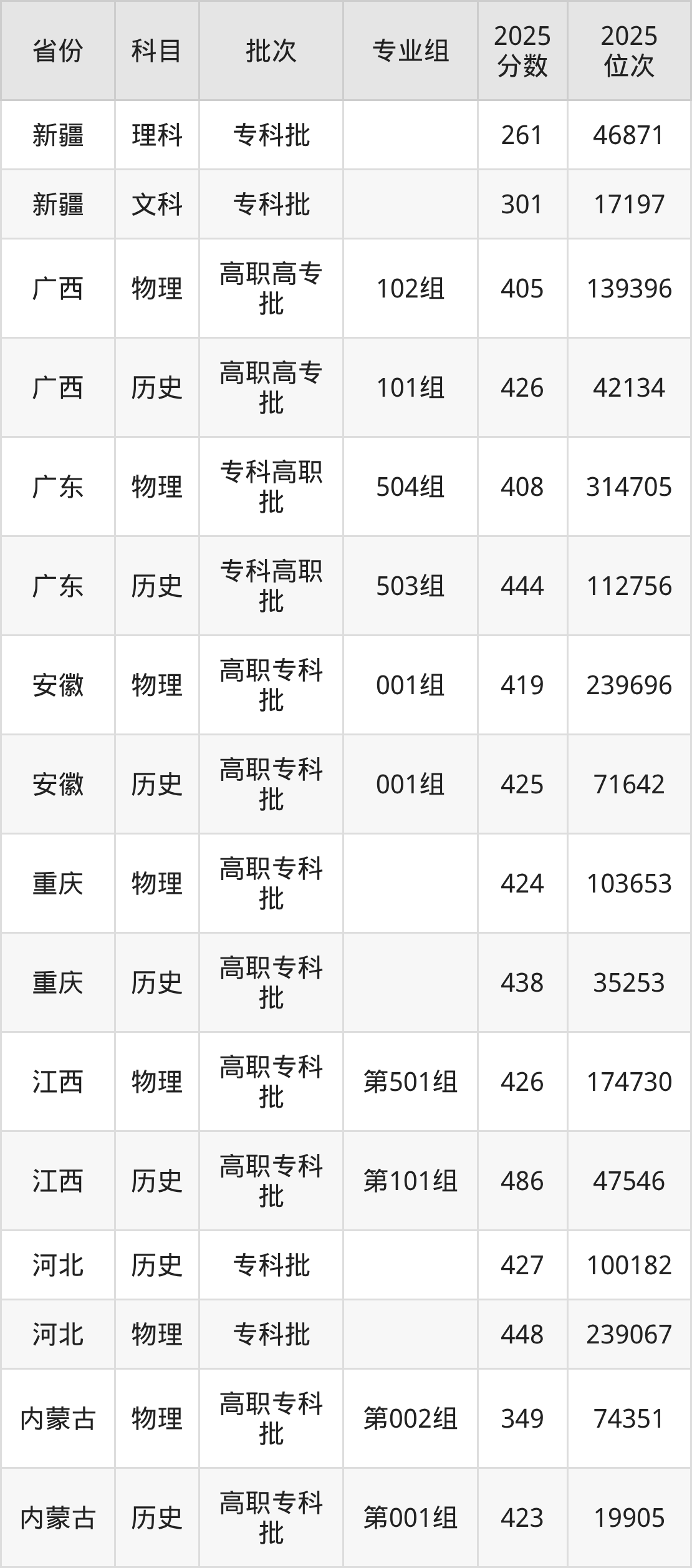 普通类专科物理类最低421分,专科历史类最低449分
