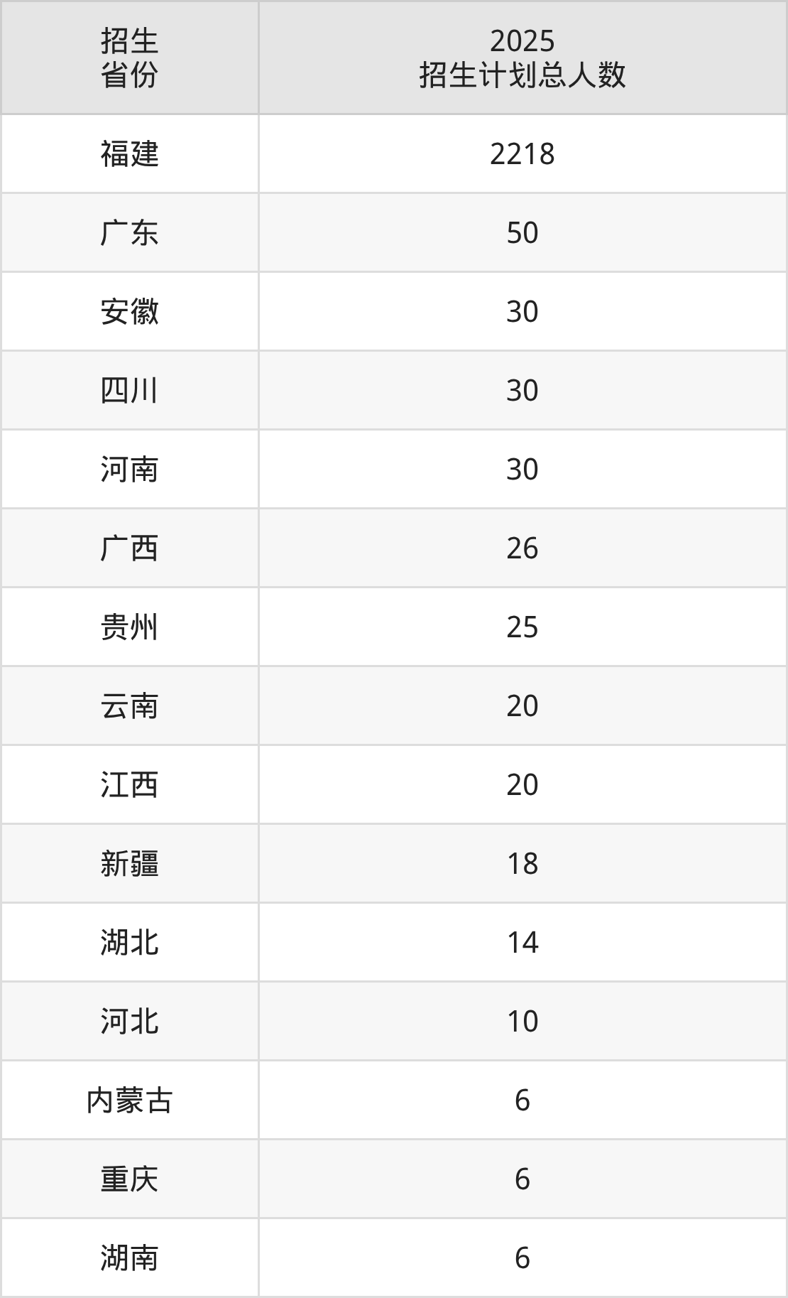 2025年漳州职业技术学院面向全国15个省市开展专科招生;招生专业共49个,招生人数共2509人。2025年在福建省招生计划总人数是2218人,其中,漳州职业技术学院在福建省招生人数最多的是应用化工技术。漳州职业技术学院在各省具体招生人数情况如下表。