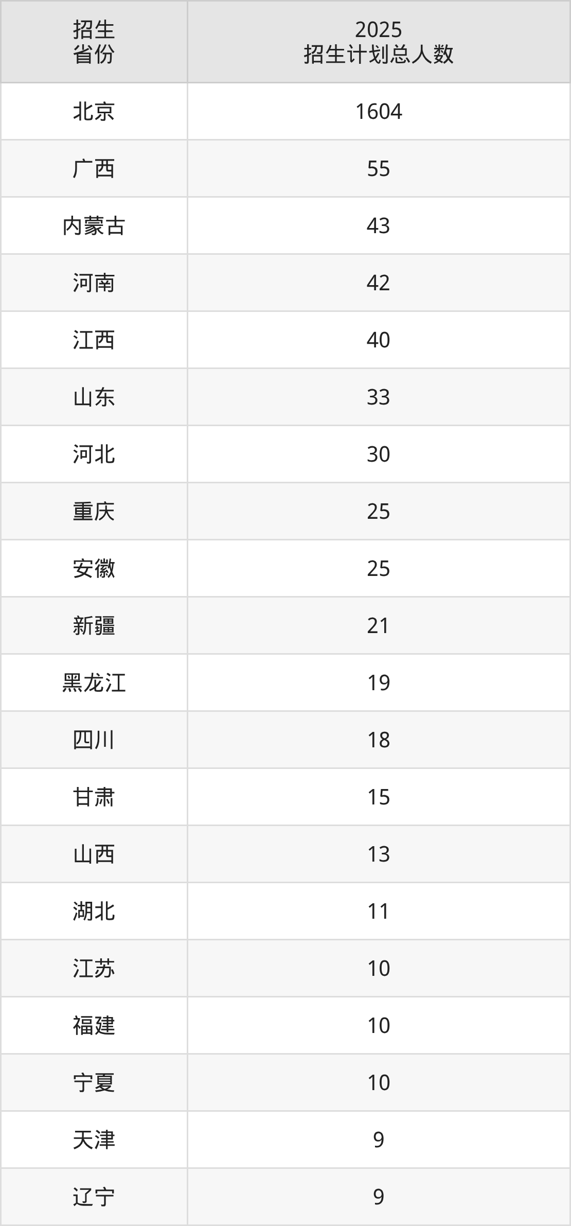 2025年北京物资学院面向全国27个省市开展本科招生;招生专业共27个,招生人数共2086人。2025年在北京市招生计划总人数是1604人,其中,北京物资学院在北京市招生人数最多的是应用统计学。北京物资学院在各省具体招生人数情况如下表。