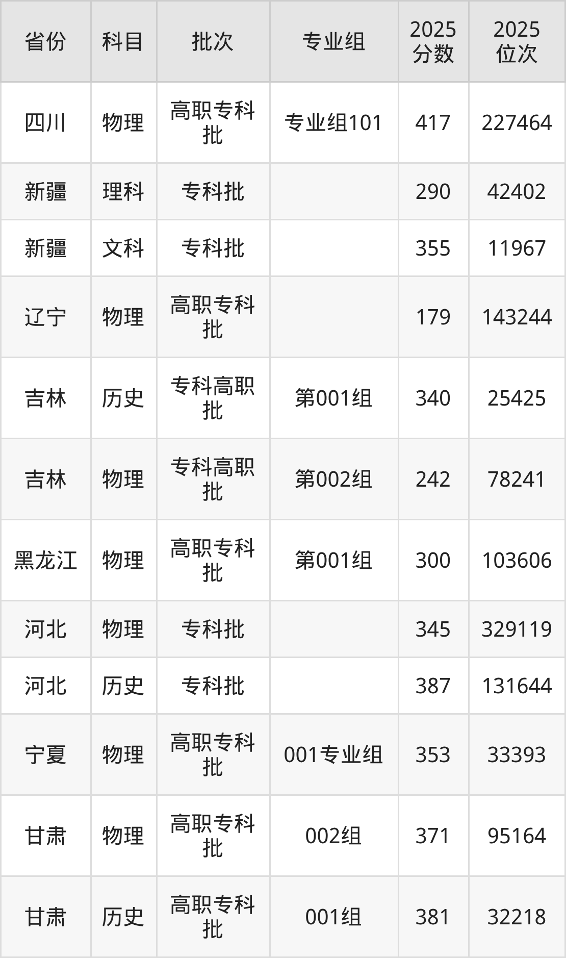 2025年在专科物理类进行招生,各专业组分数线详情如下: