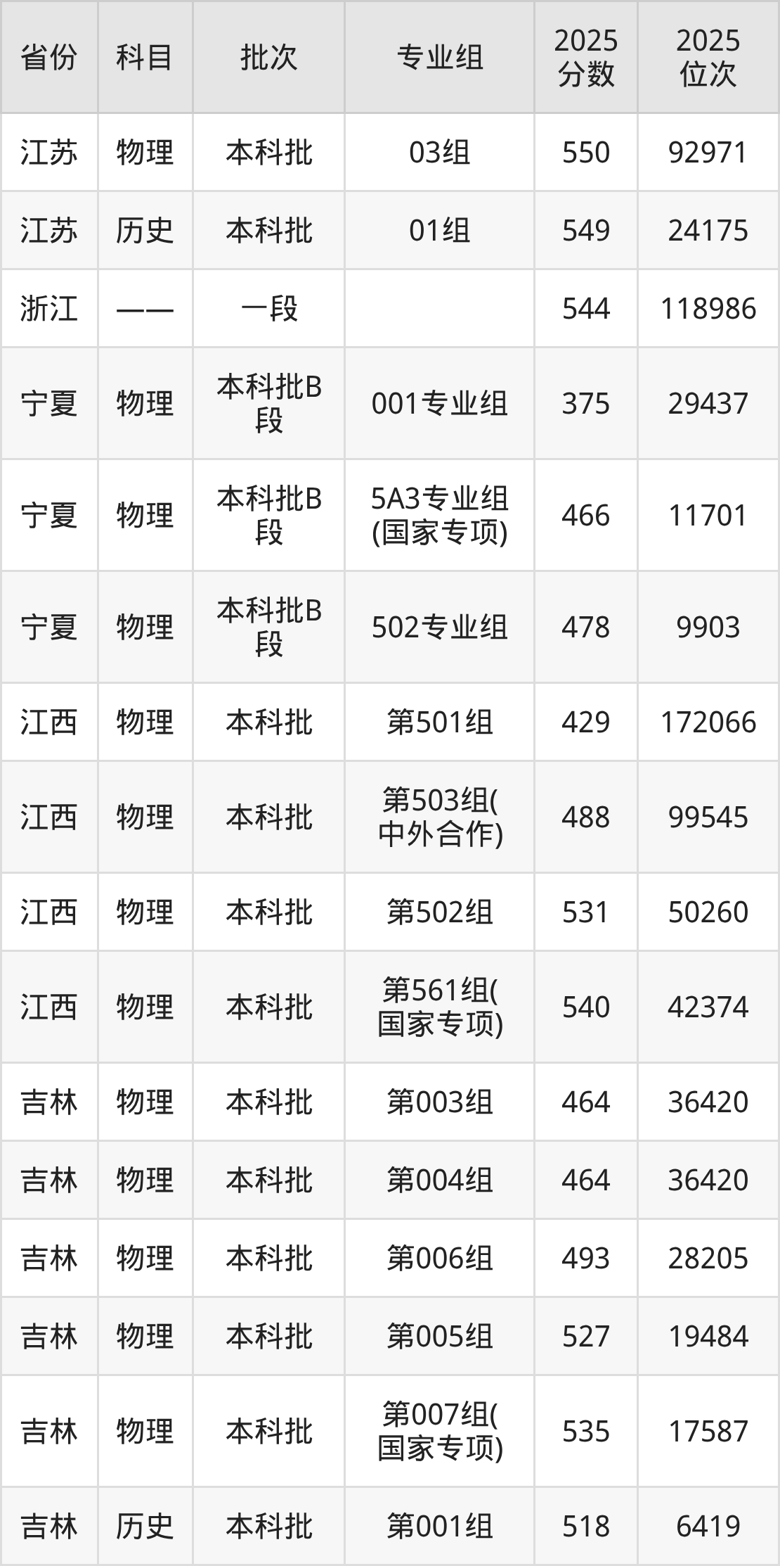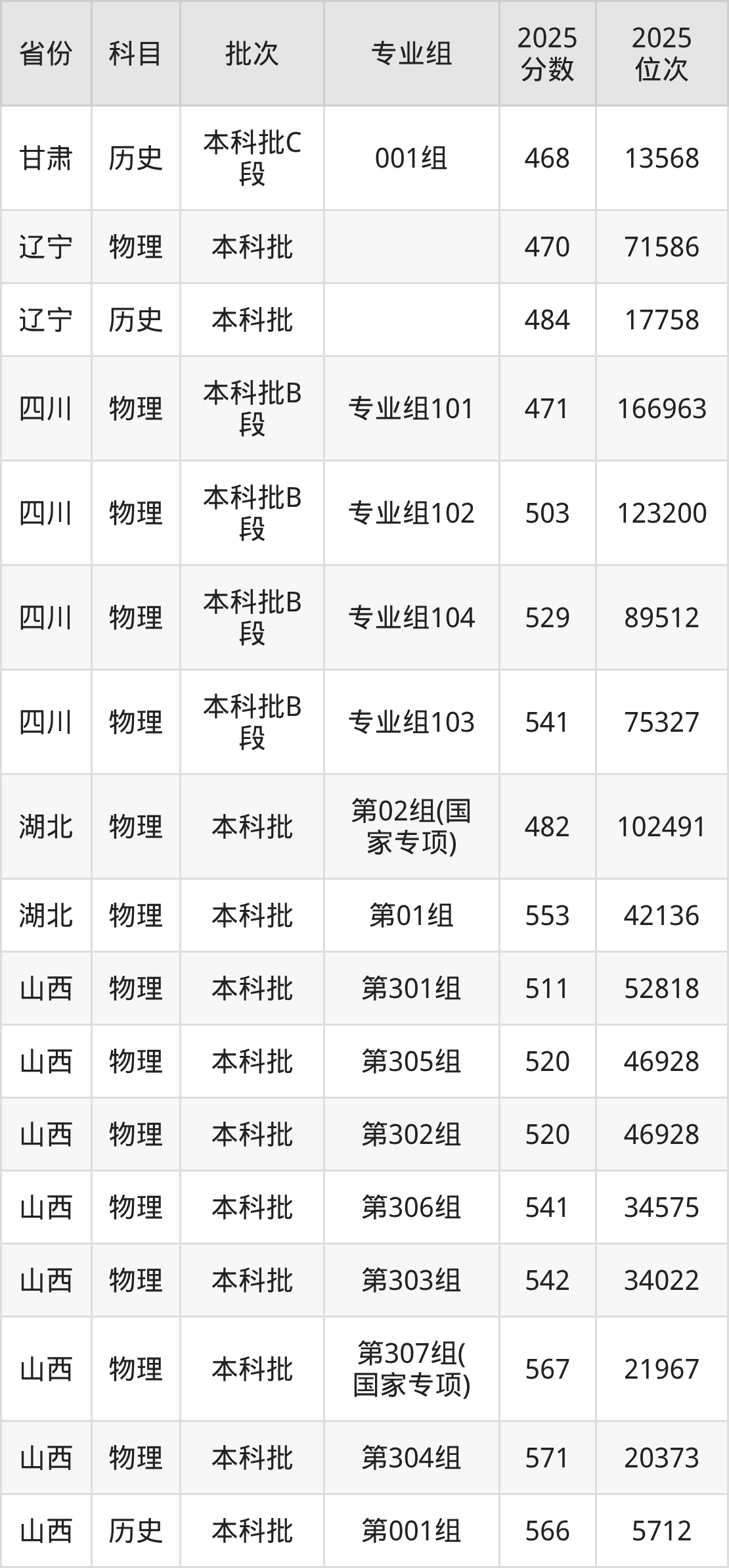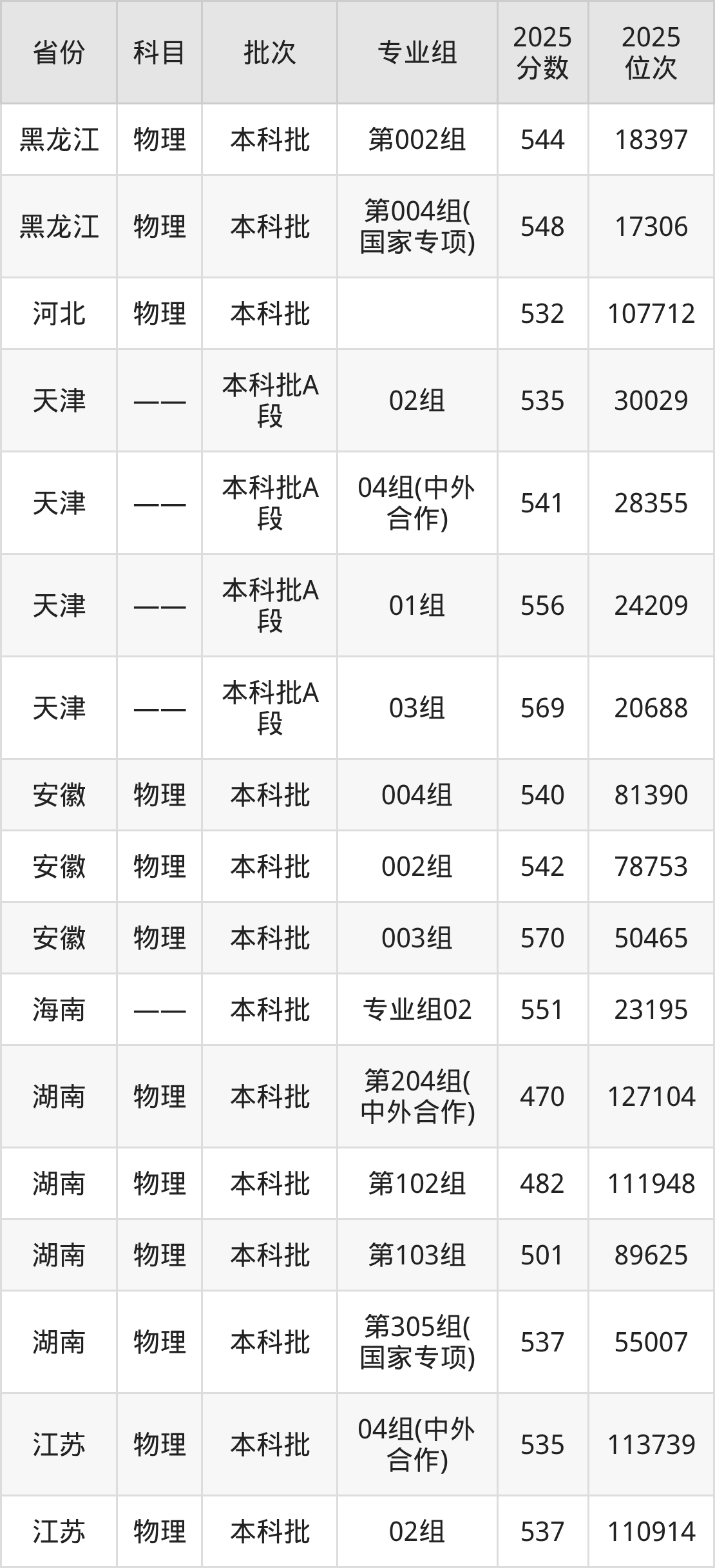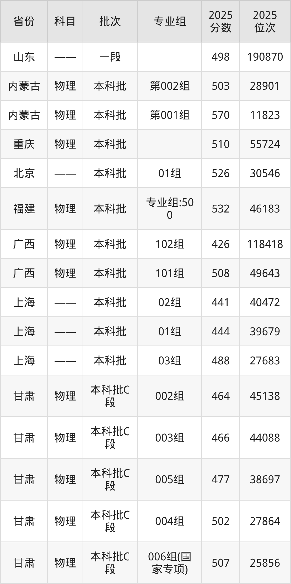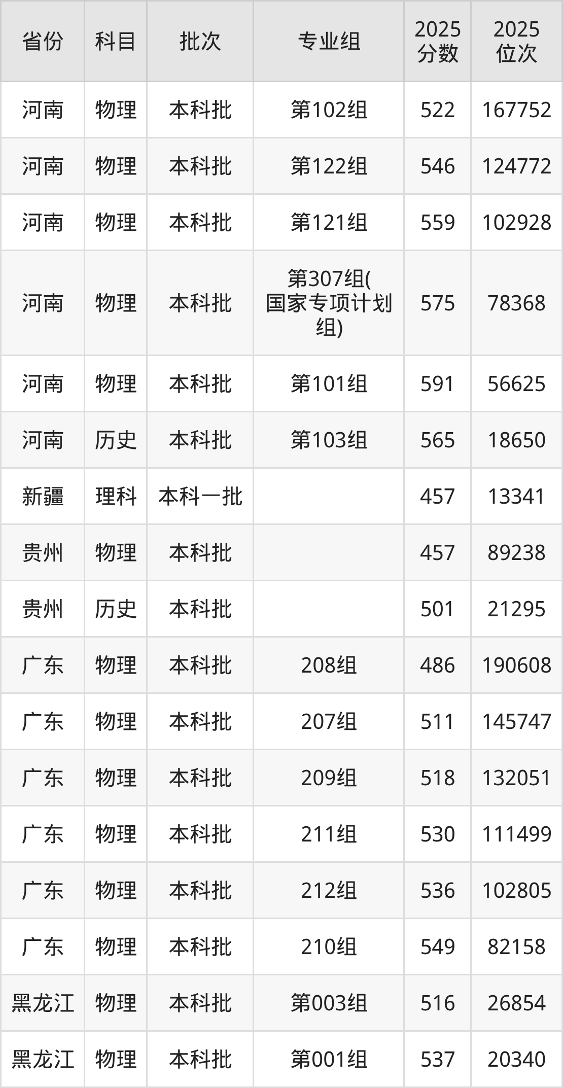 2025年在本科物理类进行招生,各专业组分数线详情如下: