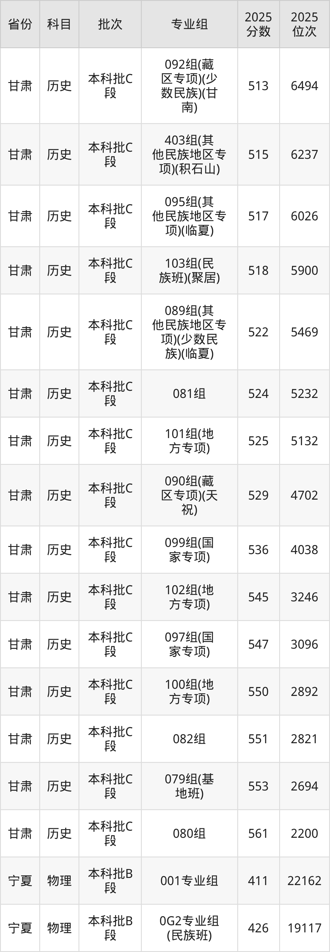 西北师范大学0G2专业组(民族班):2025年投档录取最低分为426分,录取最低位次为19117名。