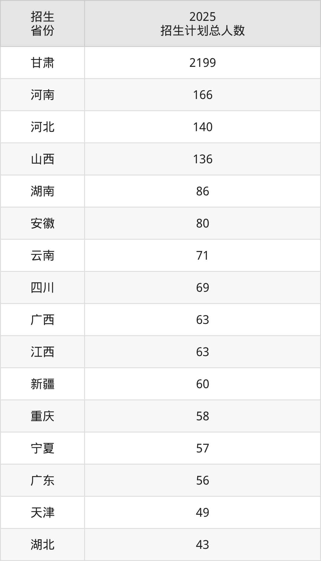 2025年西北师范大学面向全国28个省市开展本科招生;招生专业共54个,招生人数共3728人。2025年在甘肃省招生计划总人数是2199人,其中,西北师范大学在甘肃省招生人数最多的是化学。西北师范大学在各省具体招生人数情况如下表。