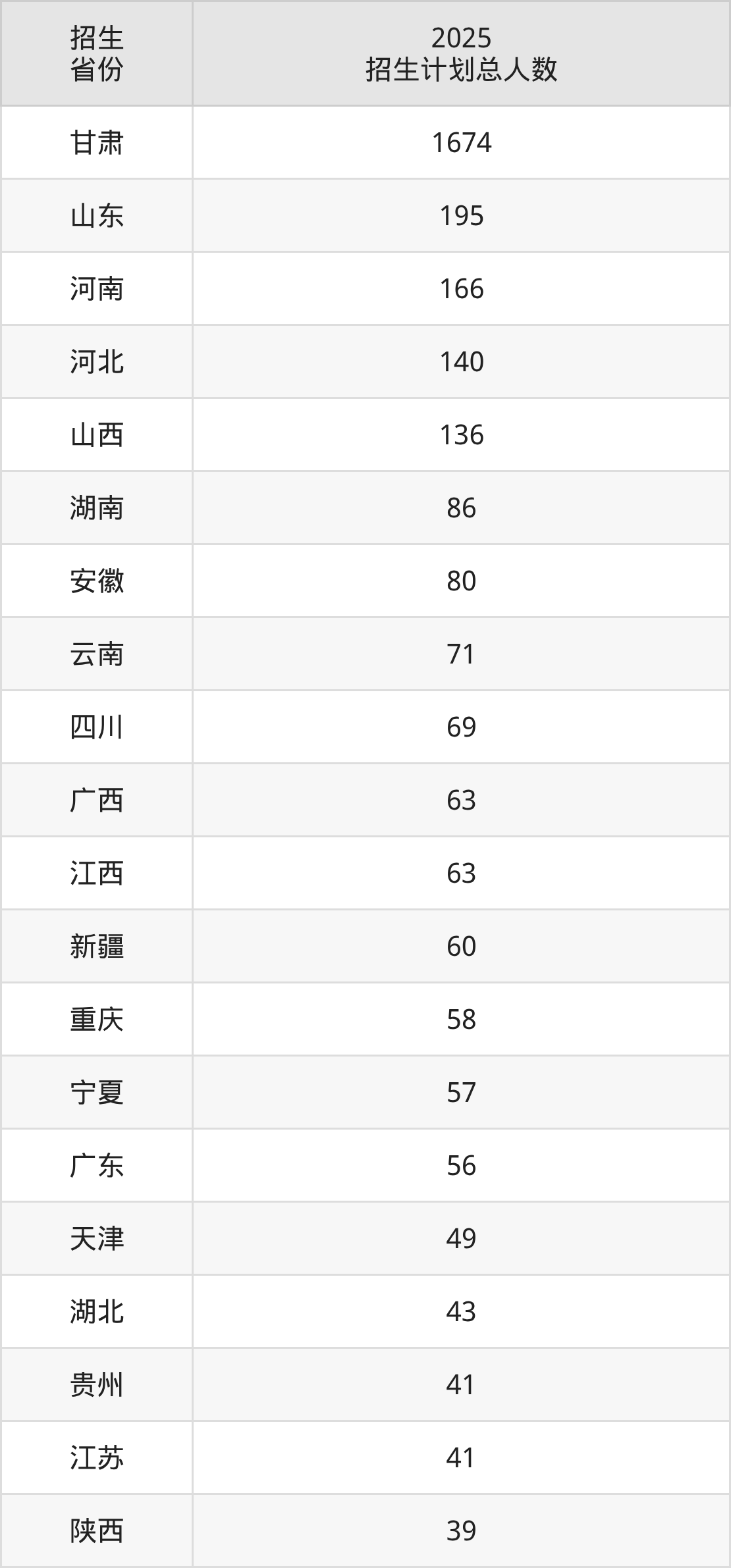 2025年西北师范大学面向全国29个省市开展本科招生;招生专业共53个,招生人数共3398人。2025年在甘肃省招生计划总人数是1674人,其中,西北师范大学在甘肃省招生人数最多的是历史学。西北师范大学在各省具体招生人数情况如下表。