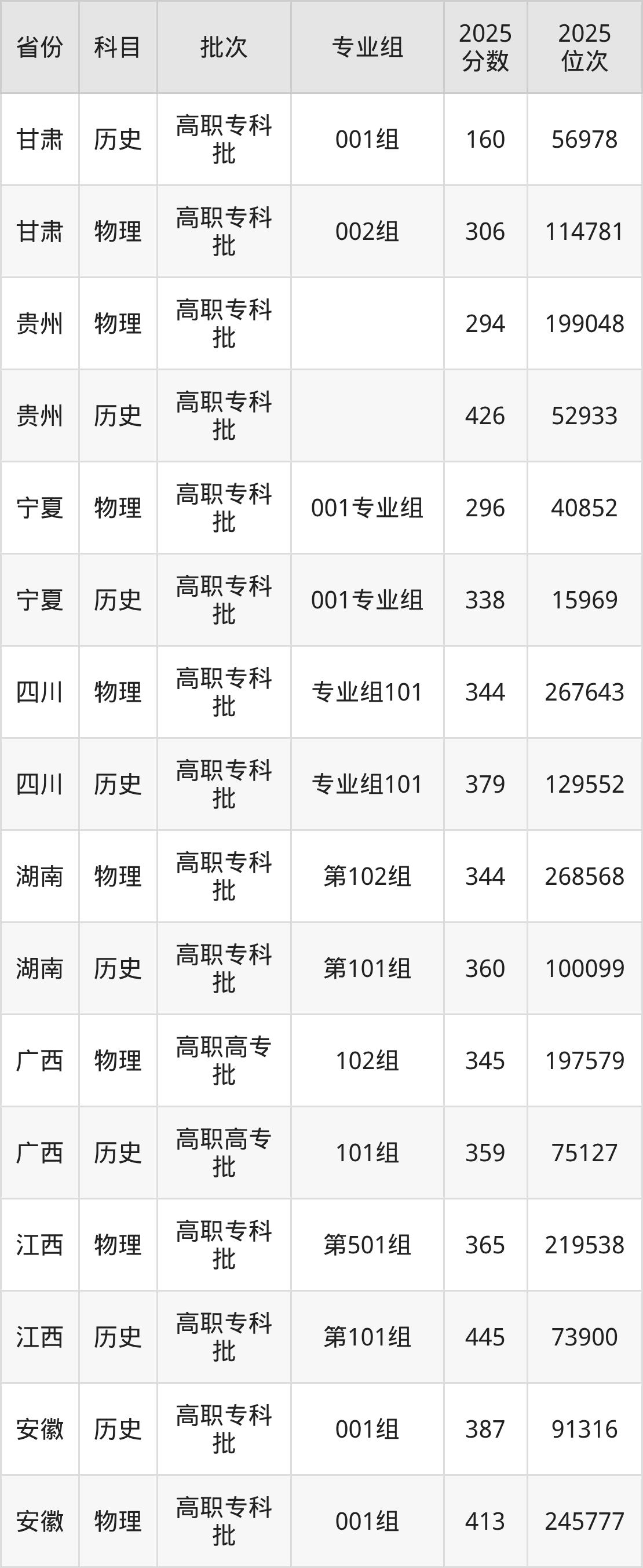 普通类专科历史类最低426分,专科物理类最低294分